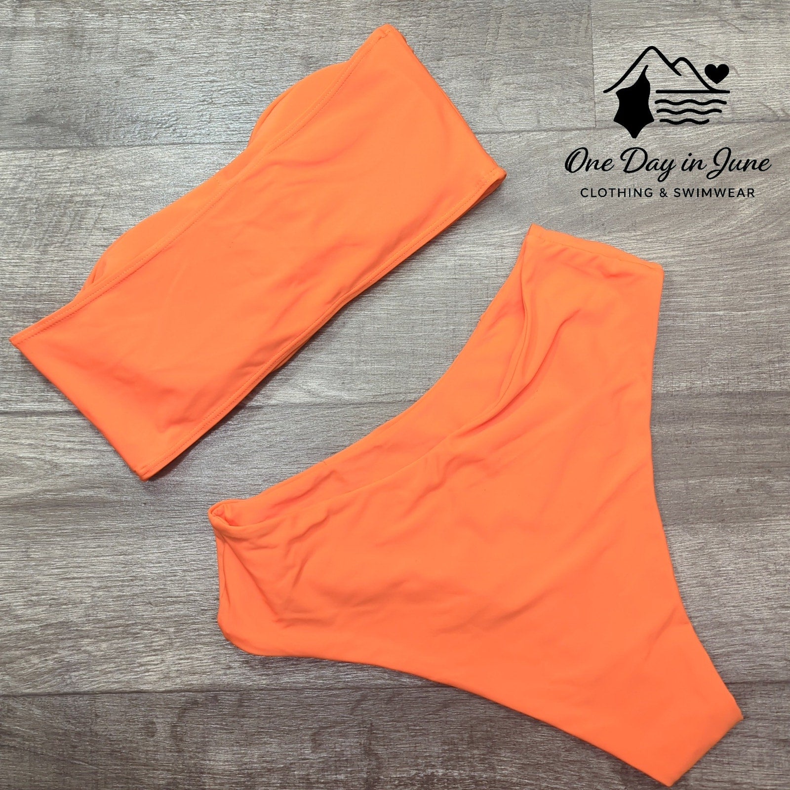 In the savage heat of summer, when the sun beats down on burning flesh like some crazed laser beam from Venus, this orange bandeau bikini stands as your last hope against the tyrannical rays. The high-cut bottoms and strapless top from Charmleaks create a silhouette so dangerously free you'll feel like you're riding bareback through the desert while the polyester-spandex blend hugs your curves tighter than a python on amphetamines.