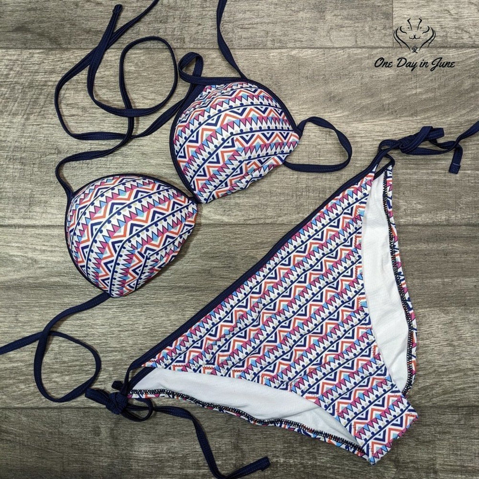 Oh what a delight, a triangle suit, with colors that shine, looking quite cute! The padded bikini with ties on the side, will make you feel fab when you're catching the tide!