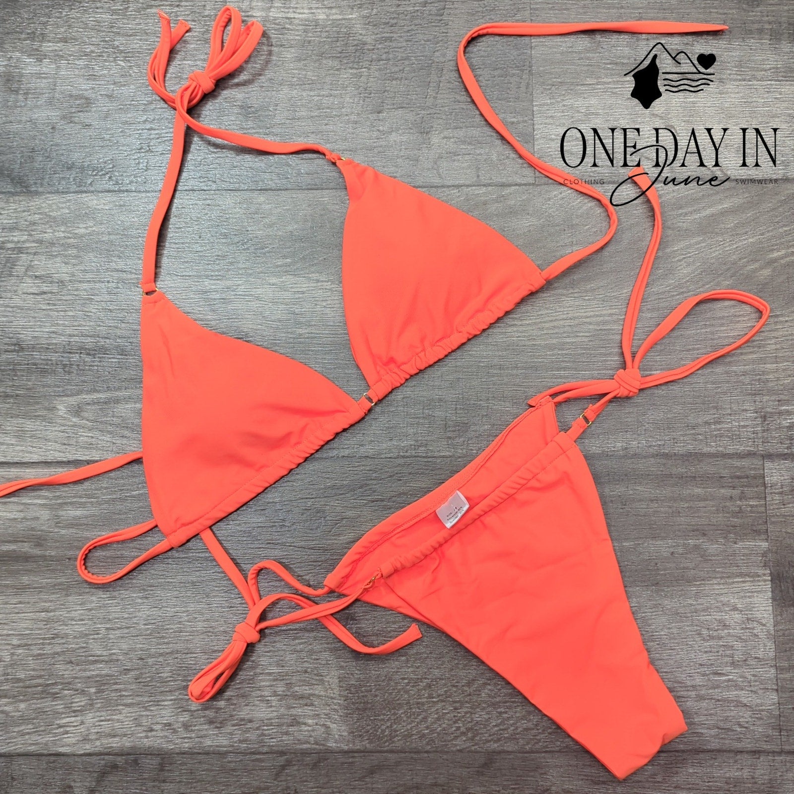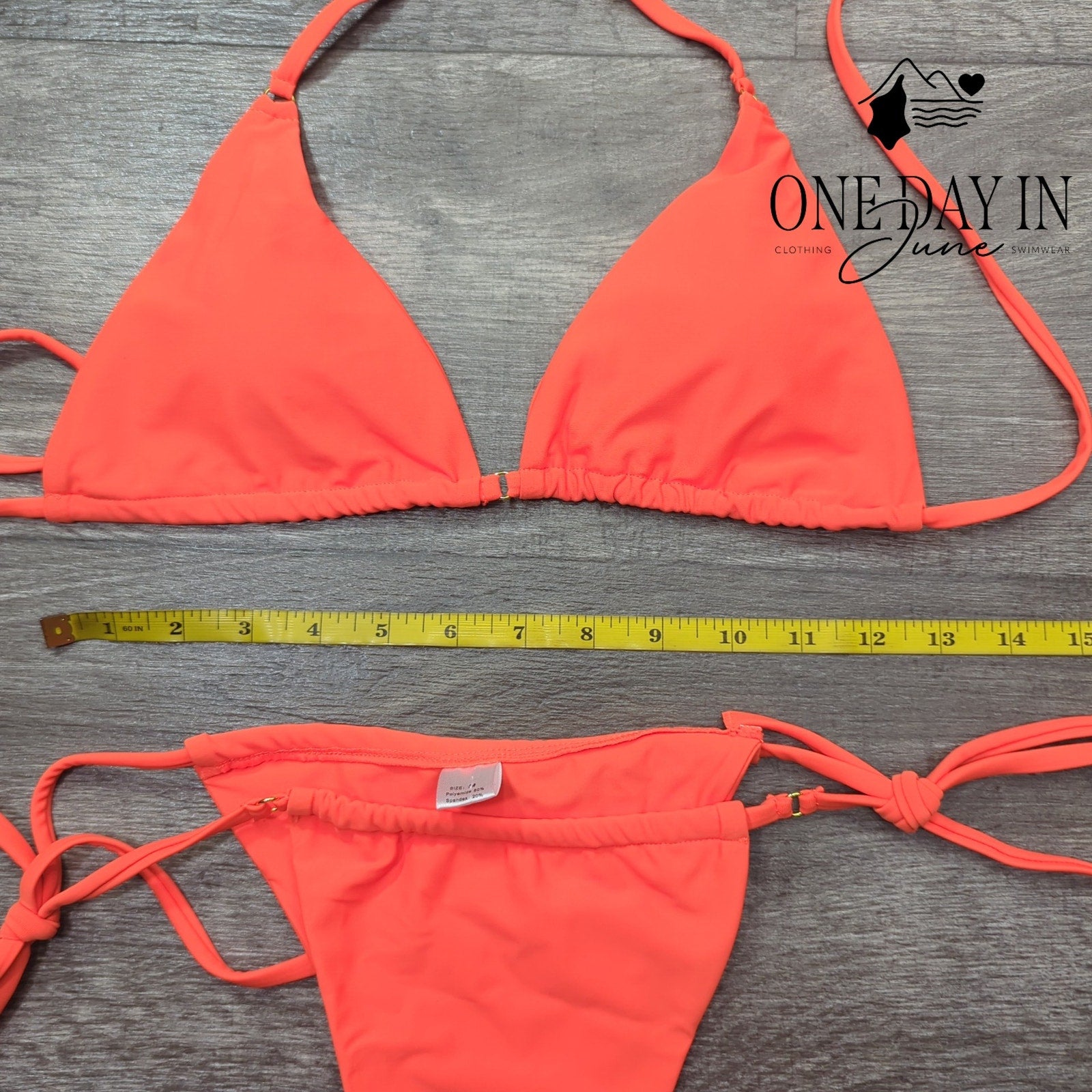 This orange triangle tie-side bikini is a savage little number that'll have you cutting through beach crowds like a neon torpedo through murky waters. The polyester-spandex blend hugs curves with the precision of a well-tuned sports car taking corners on a desert highway, while those tie sides give you the freedom to adjust your battle stance against the relentless summer sun. New without tags and ready to transform any ordinary poolside gathering into a full-throttle aquatic adventure where confidence reigns supreme and mediocrity goes to die.