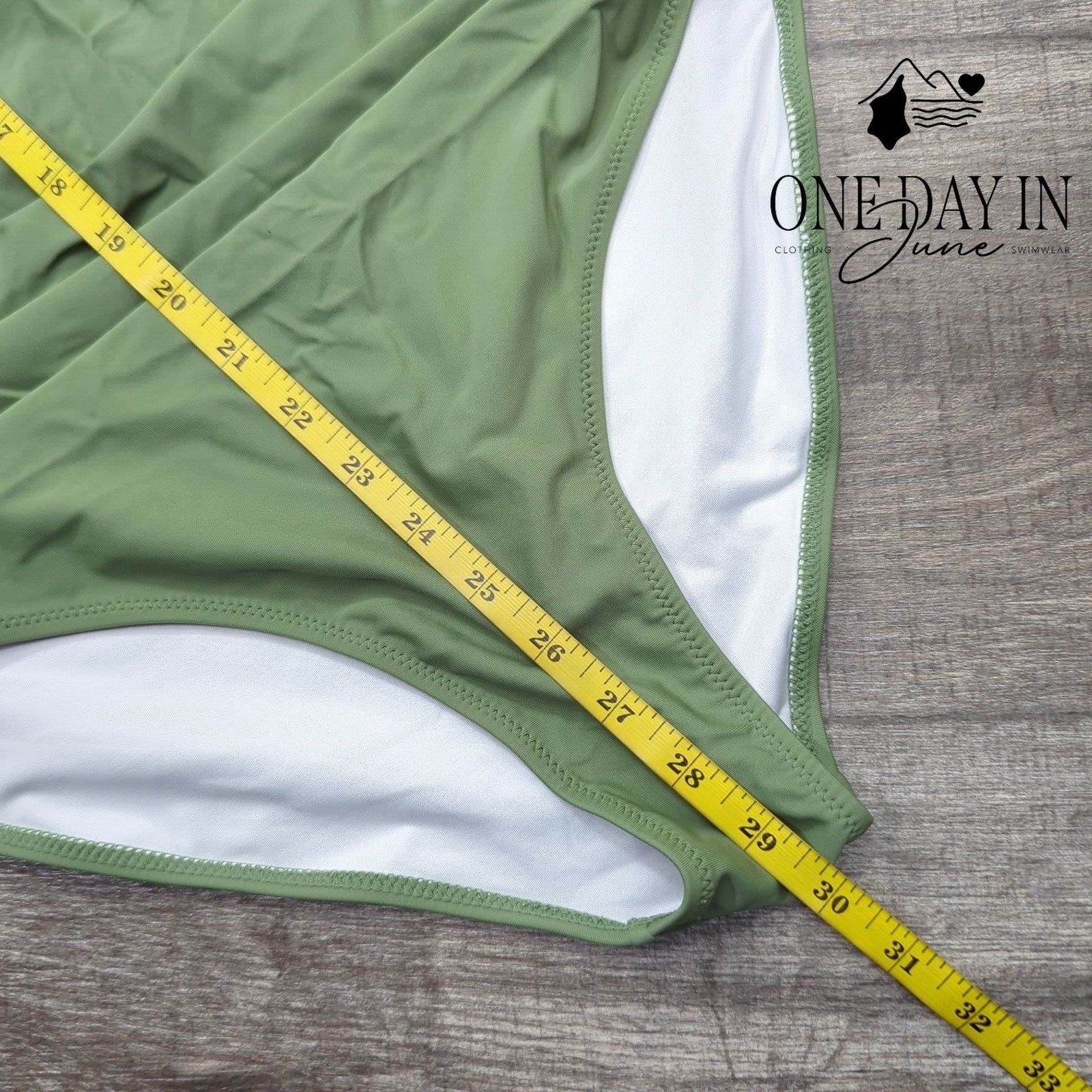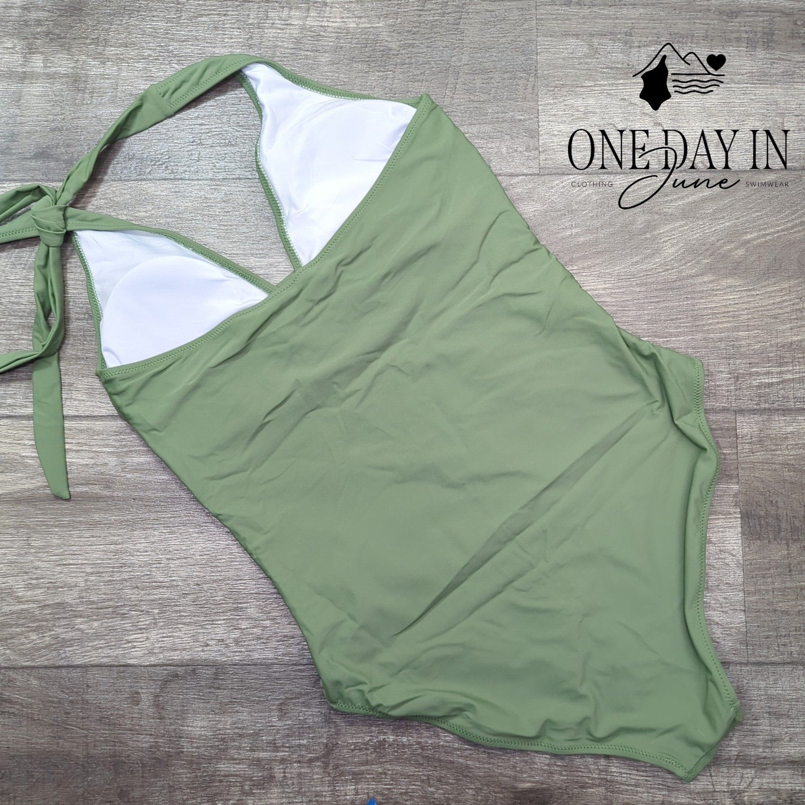 A most becoming one-piece of verdant hue, fashioned with an artfully twisted halter that speaks to both elegance and propriety in one's aquatic pursuits. The charming design promises to flatter the feminine form whilst maintaining the utmost respectability during seaside diversions. Crafted from a blend of polyester and spandex, this delightful garment offers both comfort and grace for the discerning lady's bathing costume collection.