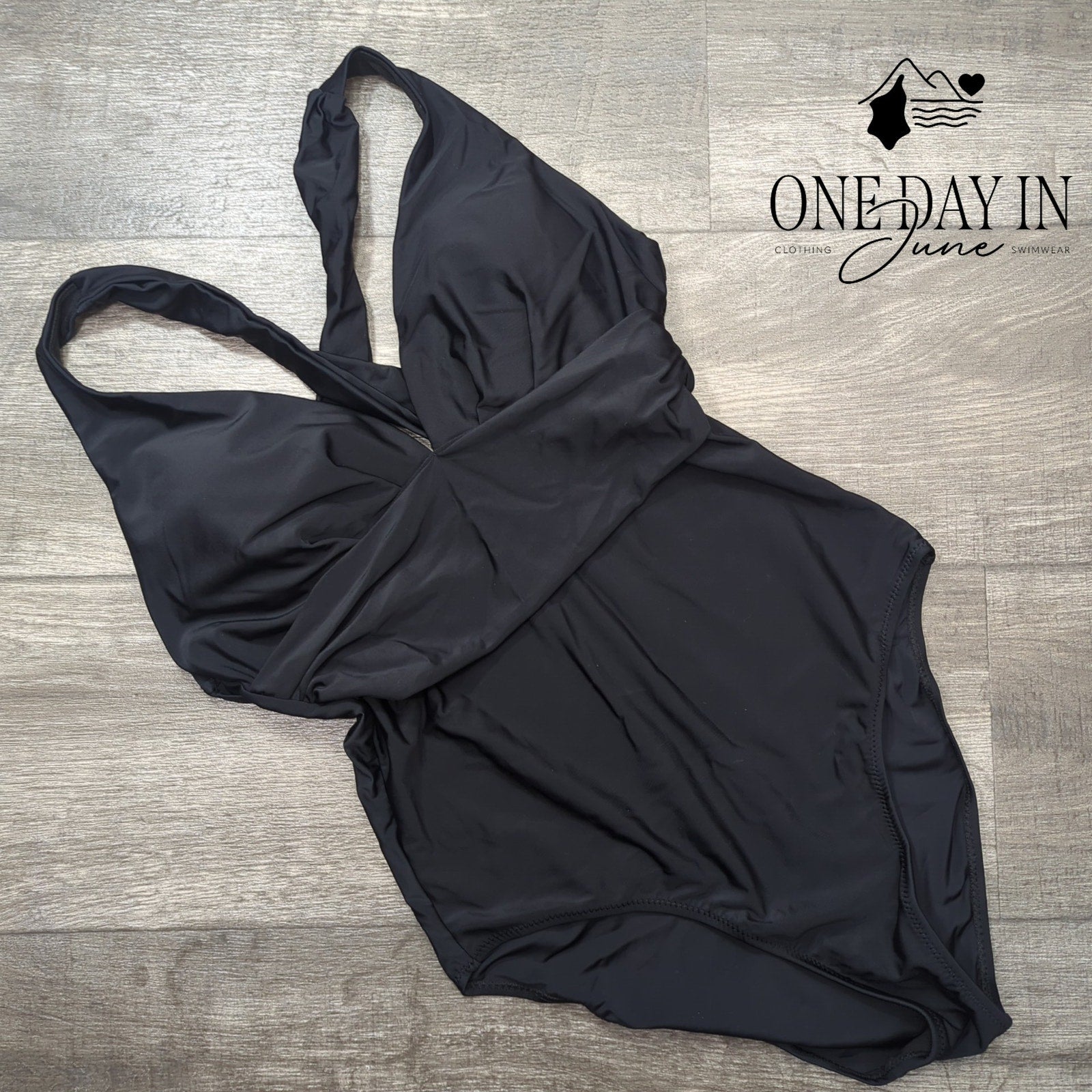 A most elegant one-piece swimming costume in the deepest black, designed with a flattering V-front silhouette that promises to enhance one's natural figure whilst providing gentle tummy control. This charming garment from CharmLeaks combines the comfort of soft polyester with the flexibility of spandex, ensuring both modesty and freedom of movement during one's aquatic pursuits. A delightful addition to any lady's bathing ensemble, perfect for seaside adventures or leisurely poolside afternoons.