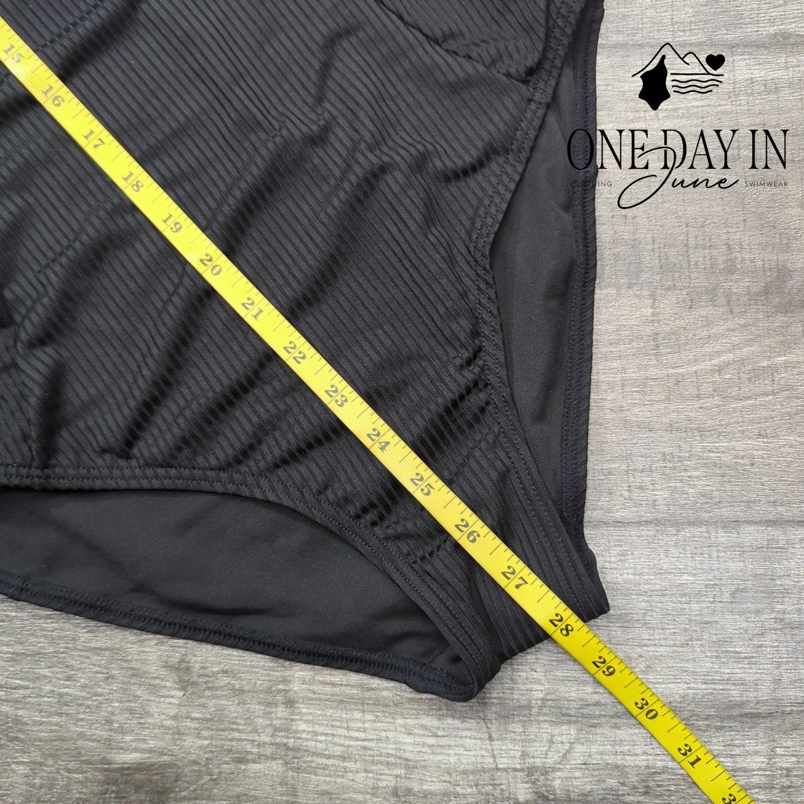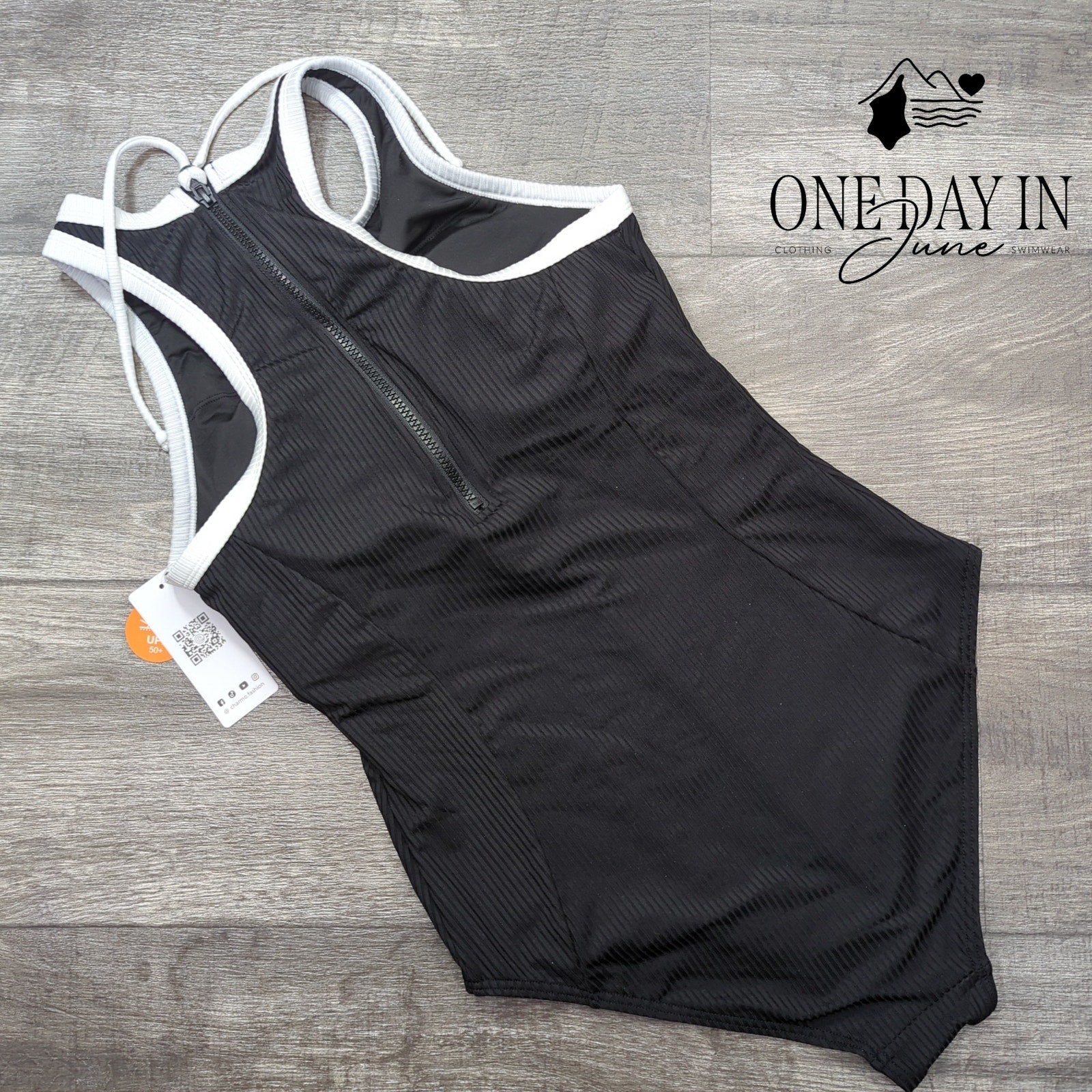 This sleek black swimsuit with ribs so fine will make you shine from head to spine! With stretchy fabric smooth and neat, this one-piece treat just can't be beat!