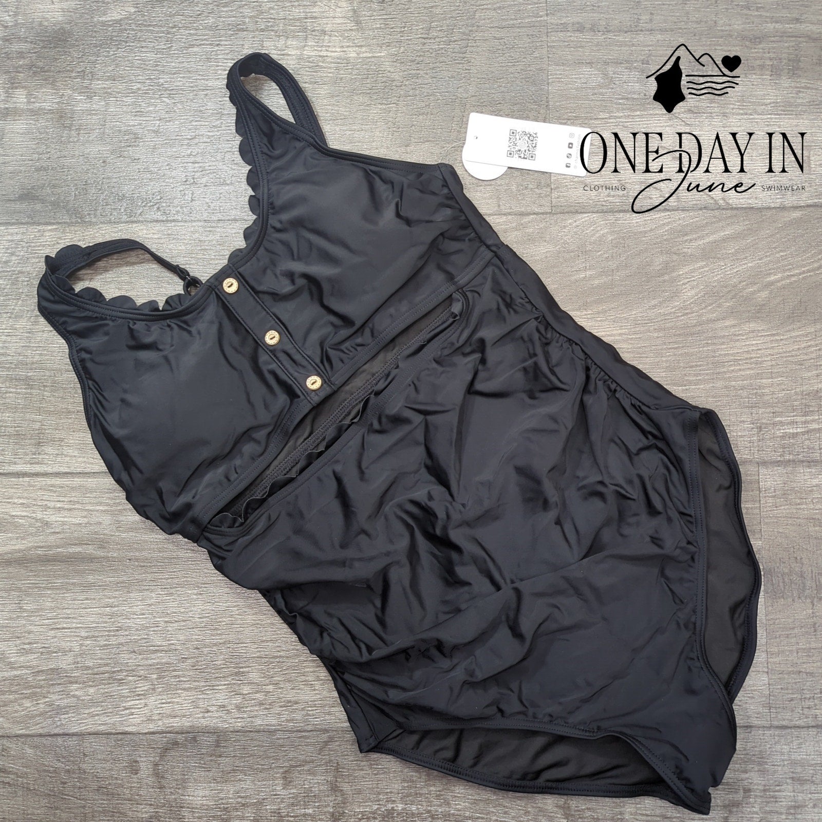 A most elegant and practical design for the expectant lady who wishes to maintain her dignity whilst taking the waters. This charming one-piece features delicate scalloped edges and artful cut-out details that flatter the maternal form with remarkable grace. Crafted in a sophisticated black hue, it promises both comfort and style for the modern woman's aquatic pursuits.