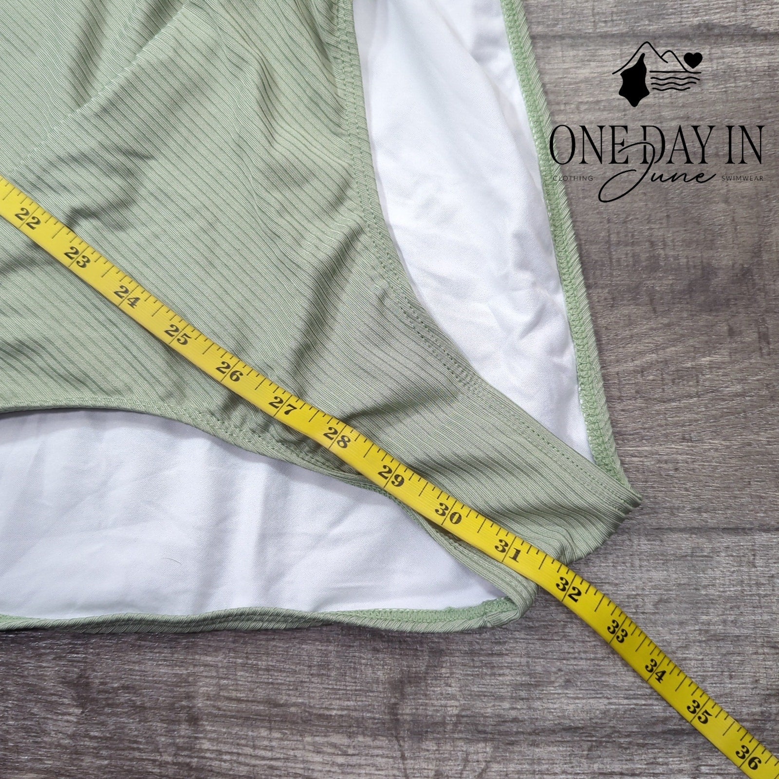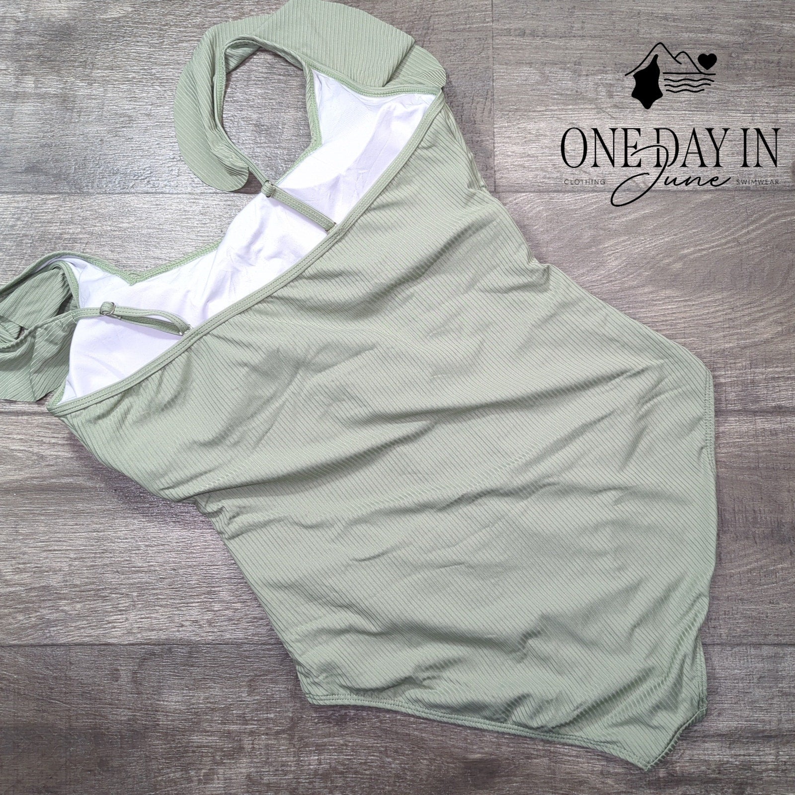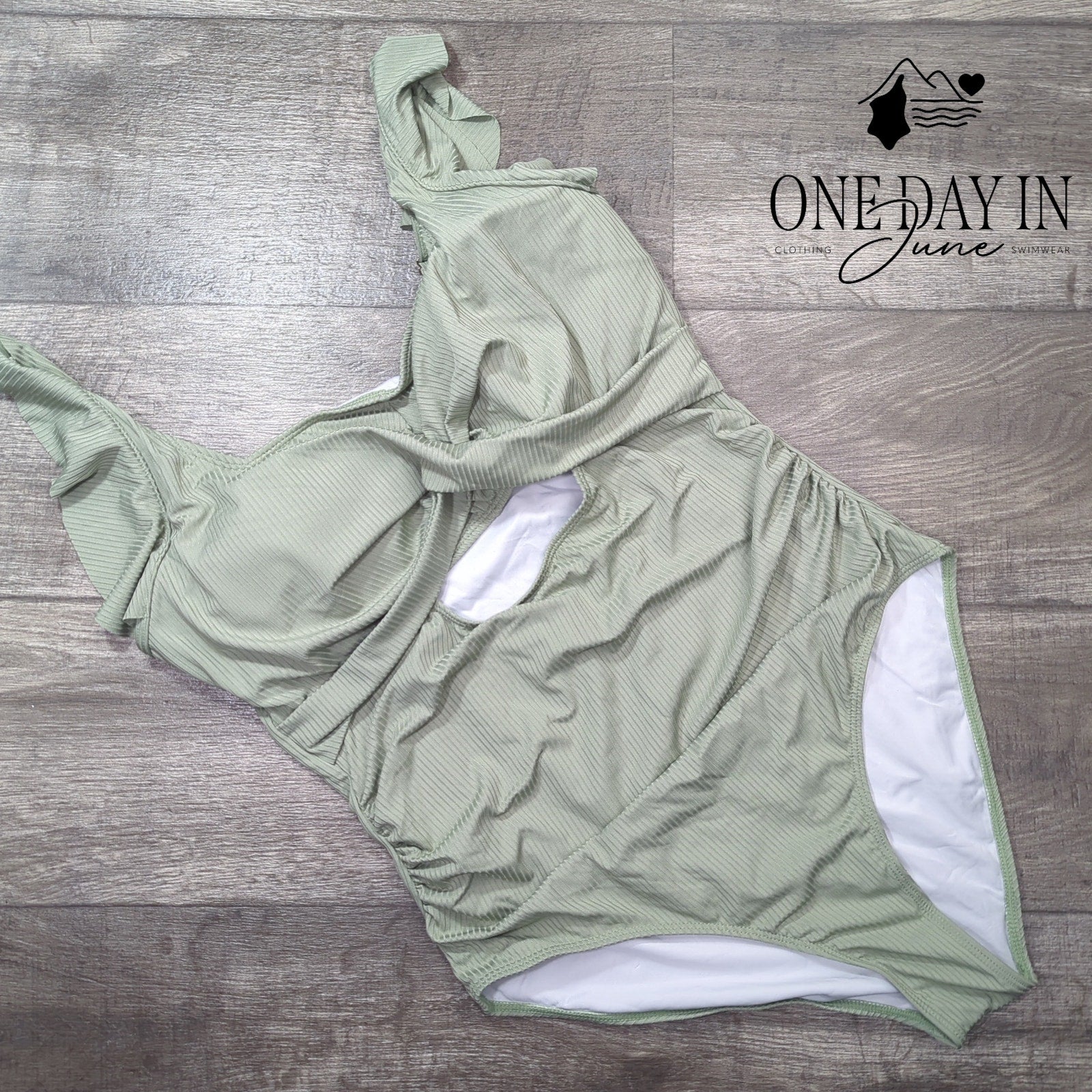 A most charming one-piece swimsuit in a verdant green hue, featuring delightfully ruffled shoulders and a modest keyhole detail that speaks to both elegance and practicality. The ribbed texture lends a pleasing dimension to the garment, whilst the superior blend of materials ensures both comfort and a flattering silhouette for any lady's aquatic pursuits.