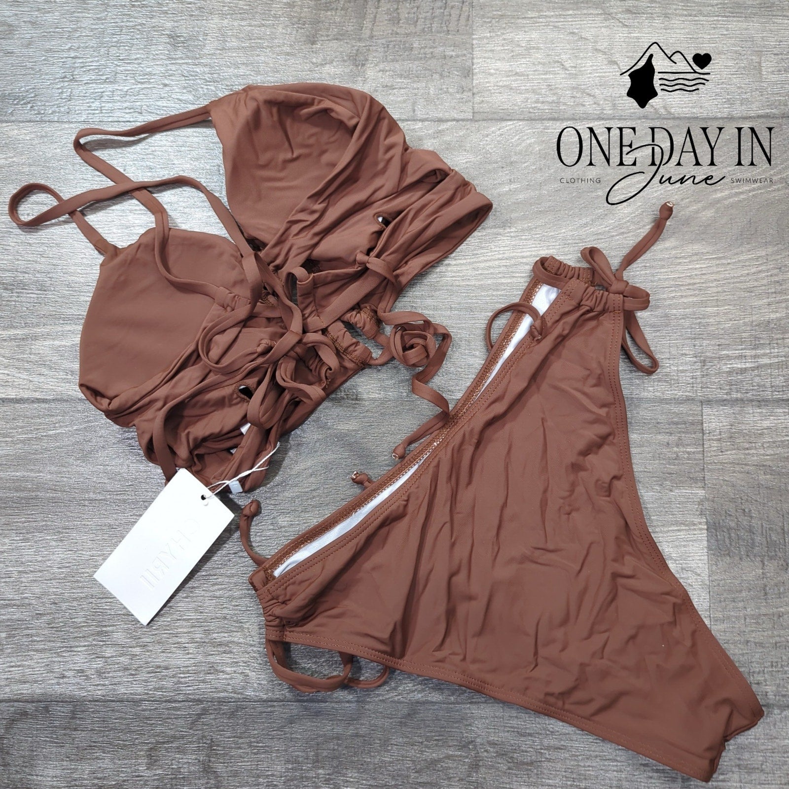This strappy brown bikini is quite the treat, with tie-side bottoms that simply can't be beat! Made of polyester and spandex so fine, this Chyrii swimsuit will help you look divine!