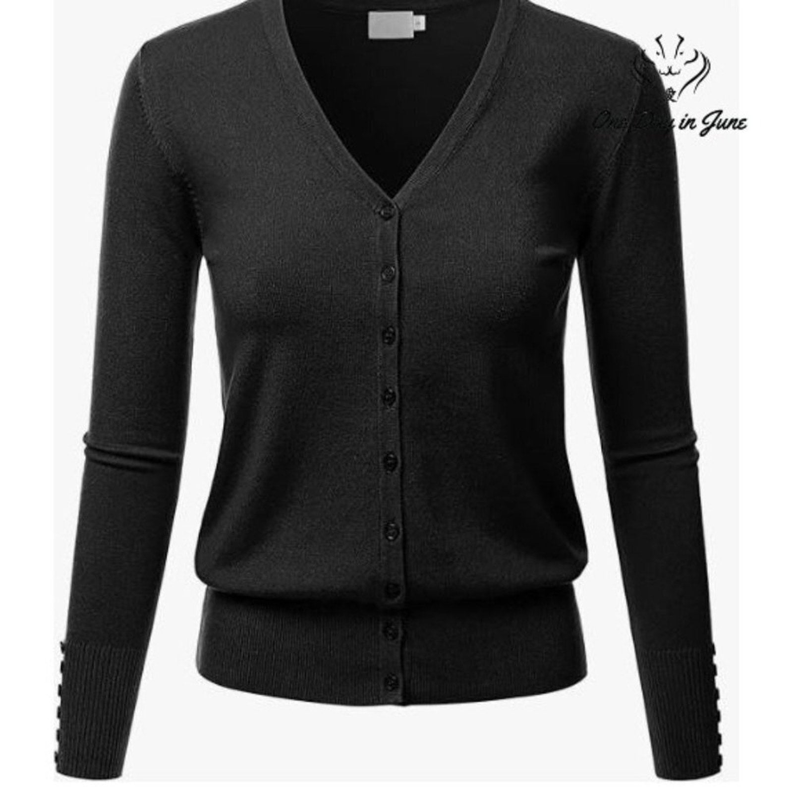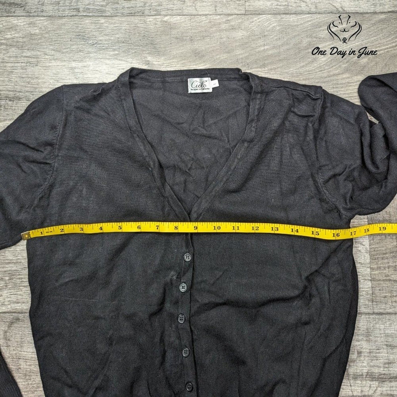 A Cielo V-neck sweater, black as an unhurried night. On the front, buttons run down like a trail of moonlight, framed by forgiving long sleeves. New it is, tags absent, woven of viscose and nylon - a garment that whispers of cool evenings and timeless style.