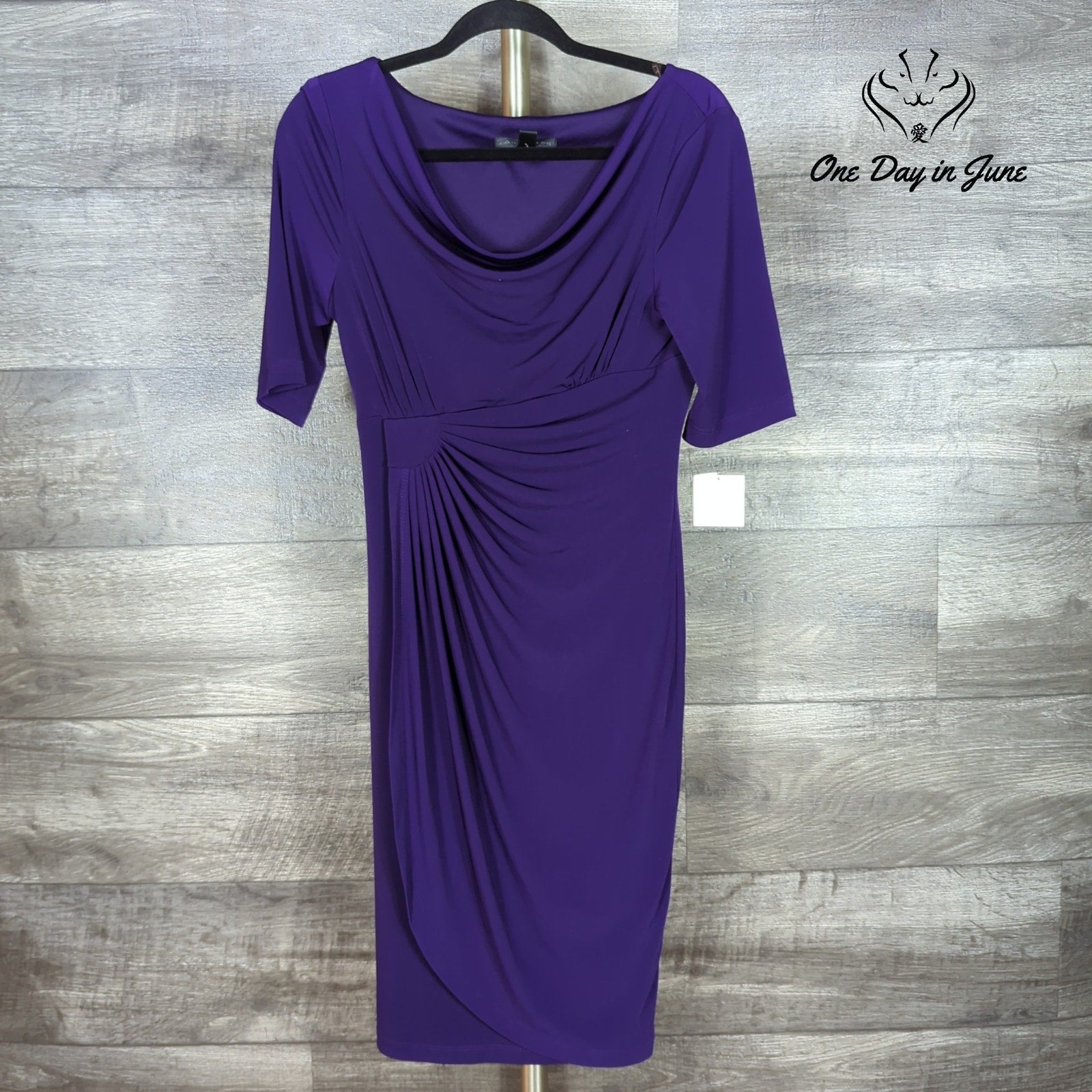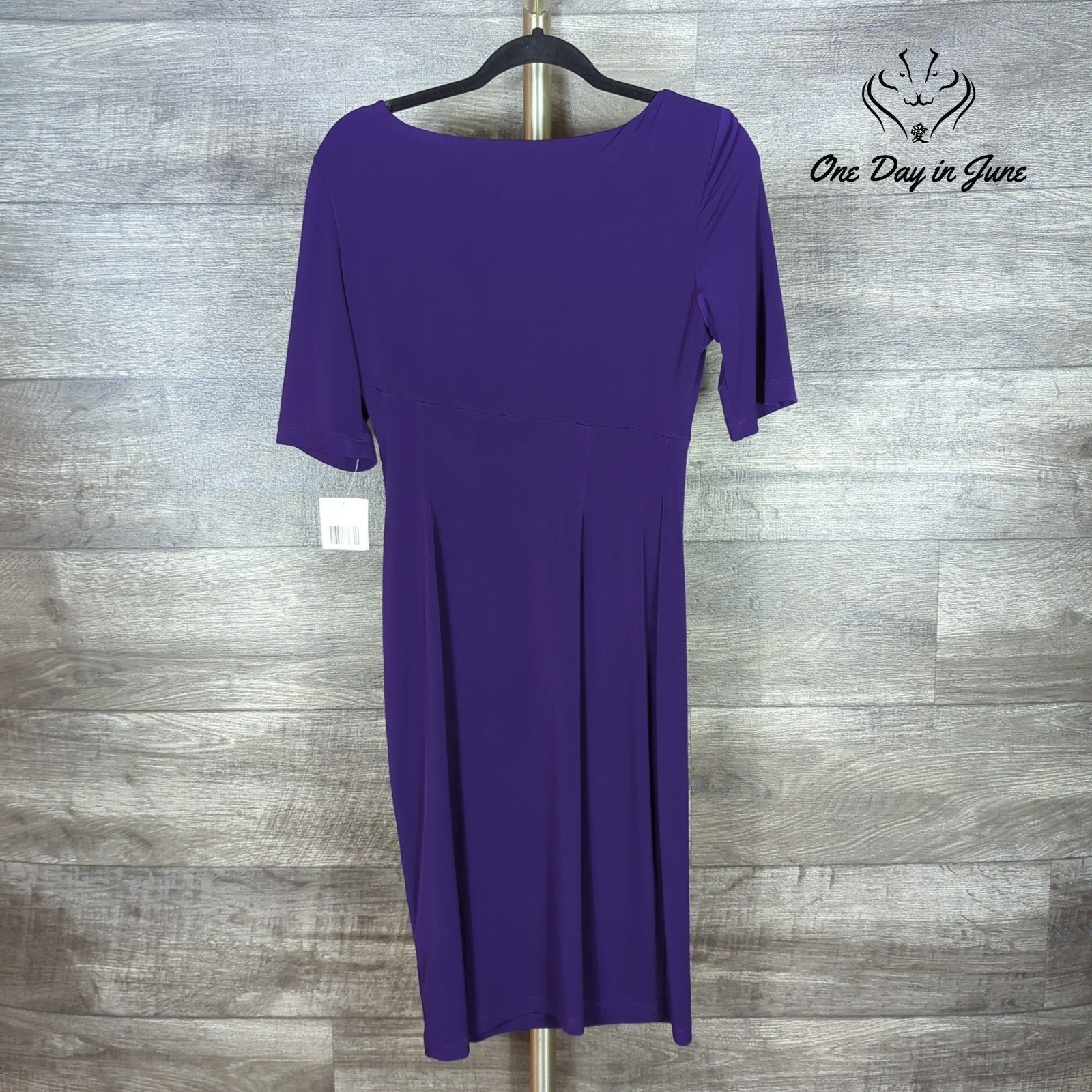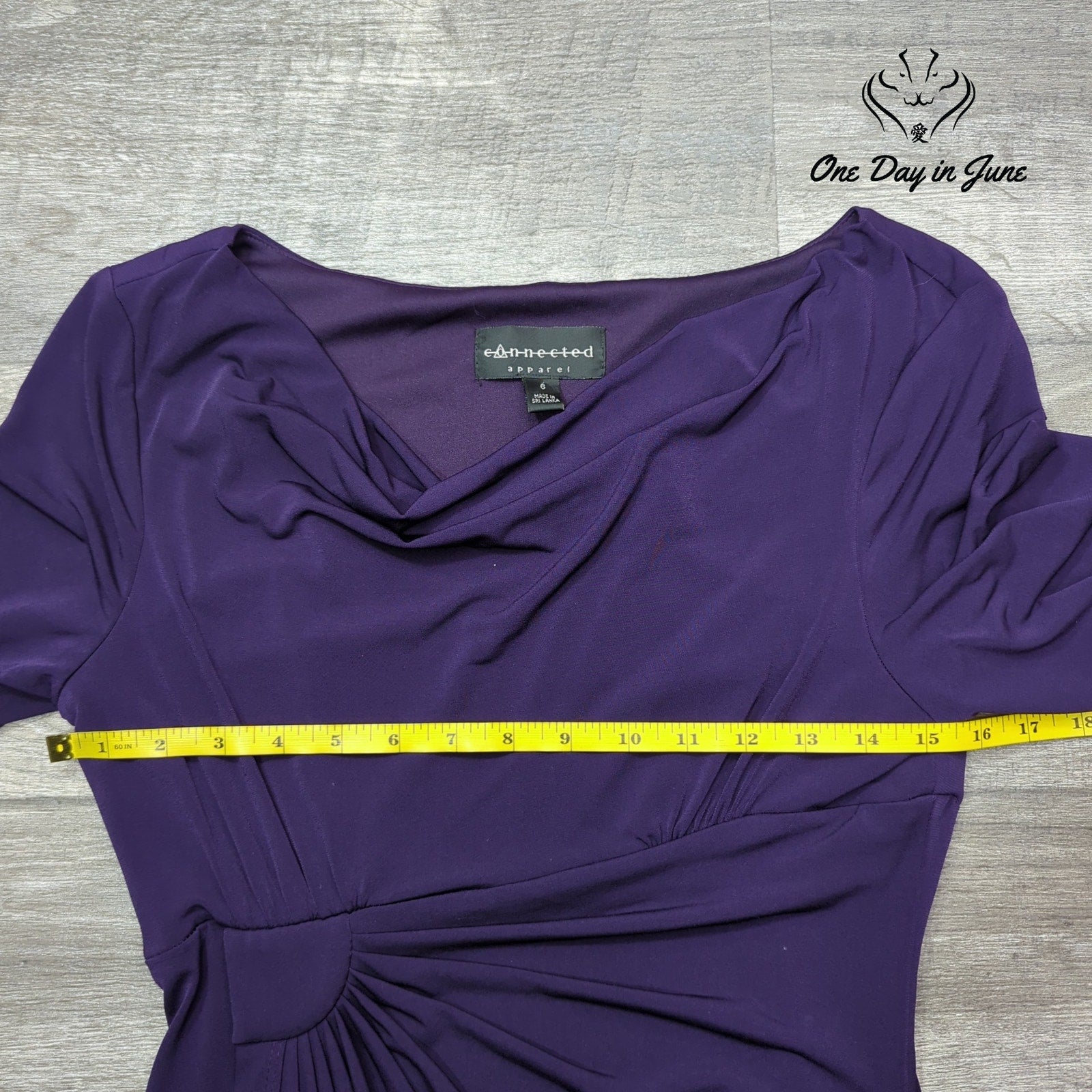 This exquisite purple bodycon dress by Connected is a vision of elegance and grace. Its short sleeves and form-fitting silhouette will flatter the figure of any discerning lady, while the polyester and spandex blend ensures both comfort and a becoming shape. A truly charming addition to one's wardrobe, perfect for an evening soirée or a promenade through town.