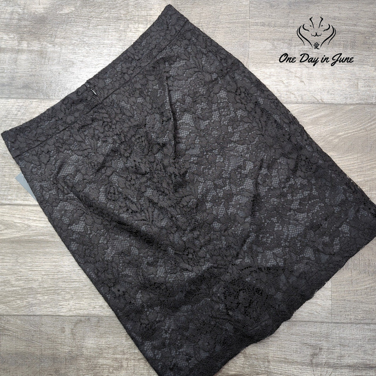This isn't just any pencil skirt, but a savage beauty crafted from delicate black lace, layered like the hidden narratives of a midnight confession in some forgotten Vegas cabaret. The pristine garment hangs unworn, its nylon-rayon blend whispering dark promises while a polyester lining keeps everything decent - though decency itself seems questionable in something this dangerously elegant.
