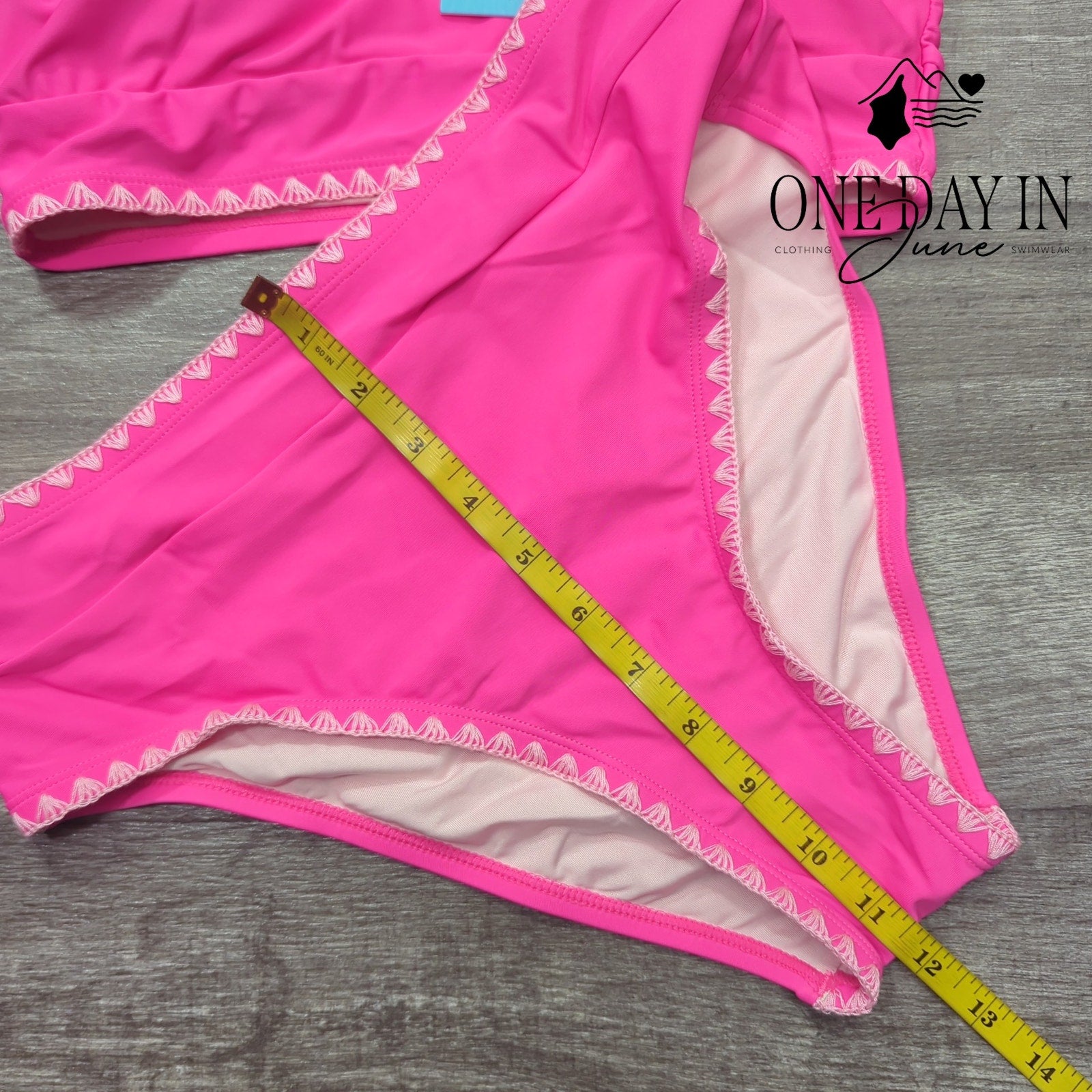 This pretty pink bikini brings such delight, with embroidered edges that sparkle so bright! A crop top creation that's new and so neat, perfect for making your swimwear complete!