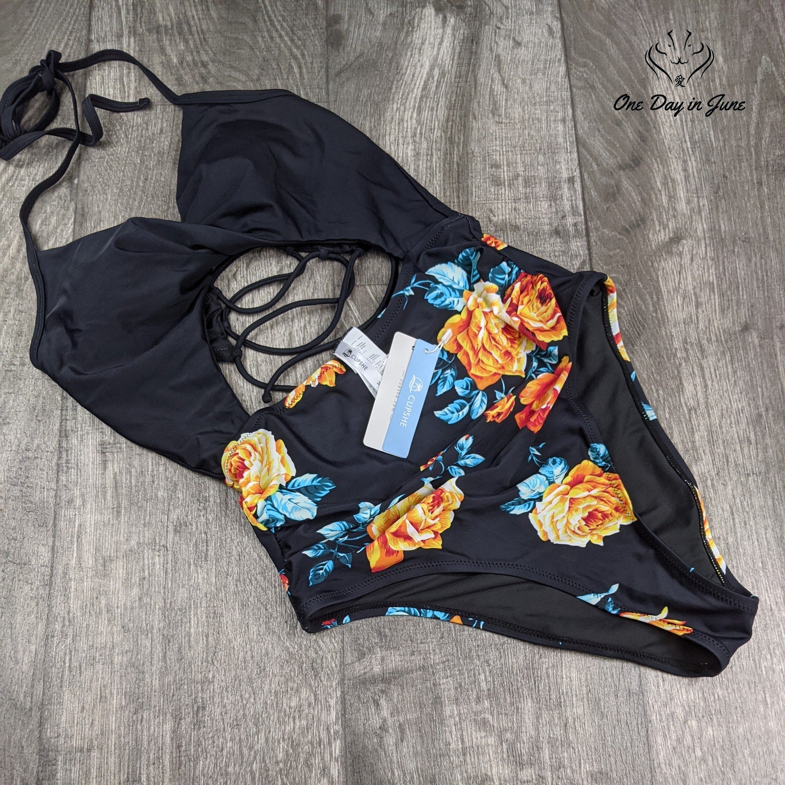 Embrace the allure of summer with this enchanting Cupshe creation. A floral symphony blooms against an ebony canvas, while a daring cutout and halter neckline evoke the spirit of carefree days by the shore.
