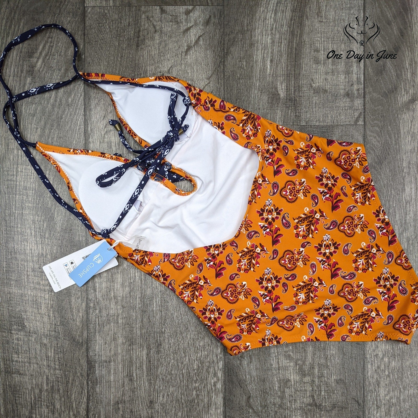 Oh my, what a sight to behold, a swimsuit in orange that's perfectly bold, with paisley designs that swirl and they sway! Brand new with tags, this Cupshe one-piece is ready to make a splash at the beach or the bay.