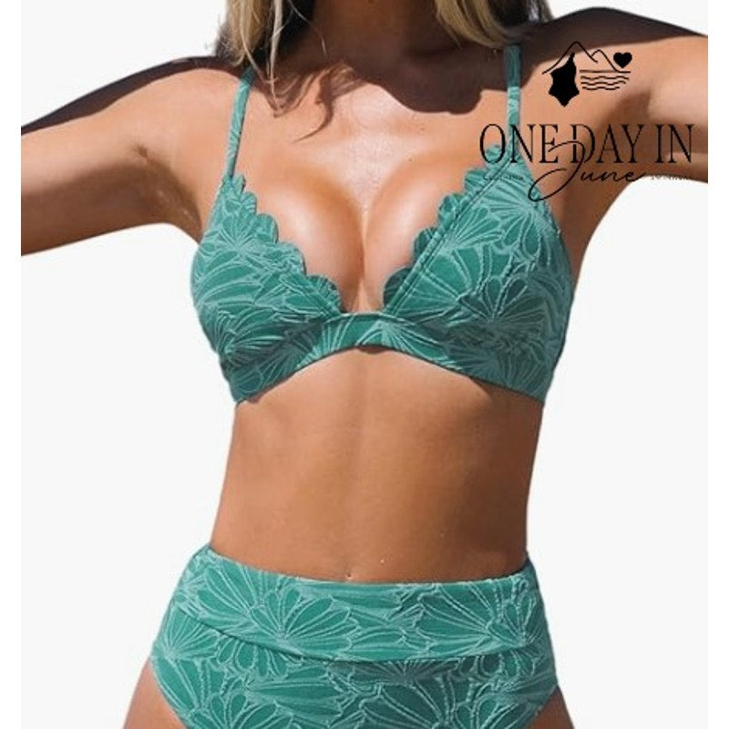A most charming green bikini of scalloped texture that speaks to the discerning lady's taste for both elegance and seaside adventure. The high waist design flatters the figure with all the grace one might expect from a well-tailored garment, while the delightful scalloped details add a touch of feminine refinement. Crafted from a blend of polyester, nylon, and spandex, this delightful ensemble promises both comfort and durability for your aquatic pursuits.