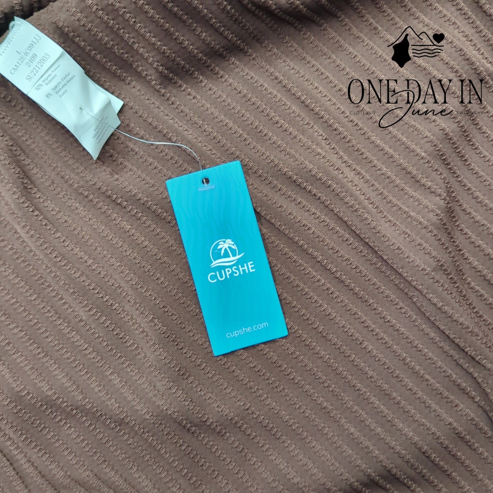 A most becoming one-piece of rich brown hue, featuring an elegant high neckline that speaks to refined sensibilities while maintaining the utmost propriety for seaside diversions. The artfully placed cut-out details add a touch of modern intrigue to this textured design, ensuring the wearer shall command attention at any bathing establishment. This charming Cupshe creation arrives in pristine condition, ready to accompany its fortunate new owner on the most delightful aquatic adventures.