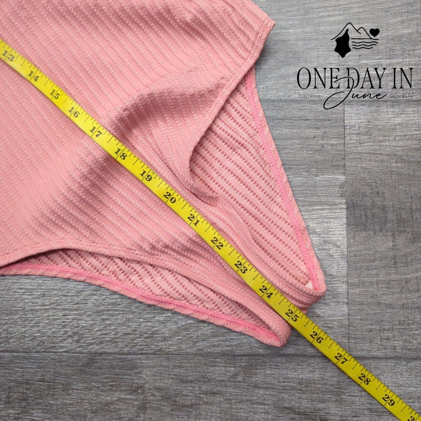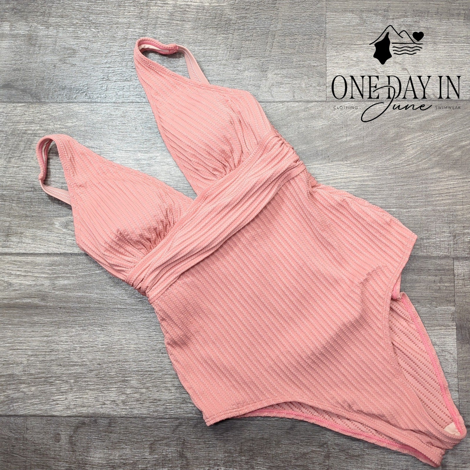 This pretty pink piece with texture so fine, has a V-neck that's simply divine! New with tags and ready to shine, this one-piece swimsuit will make you look sublime!