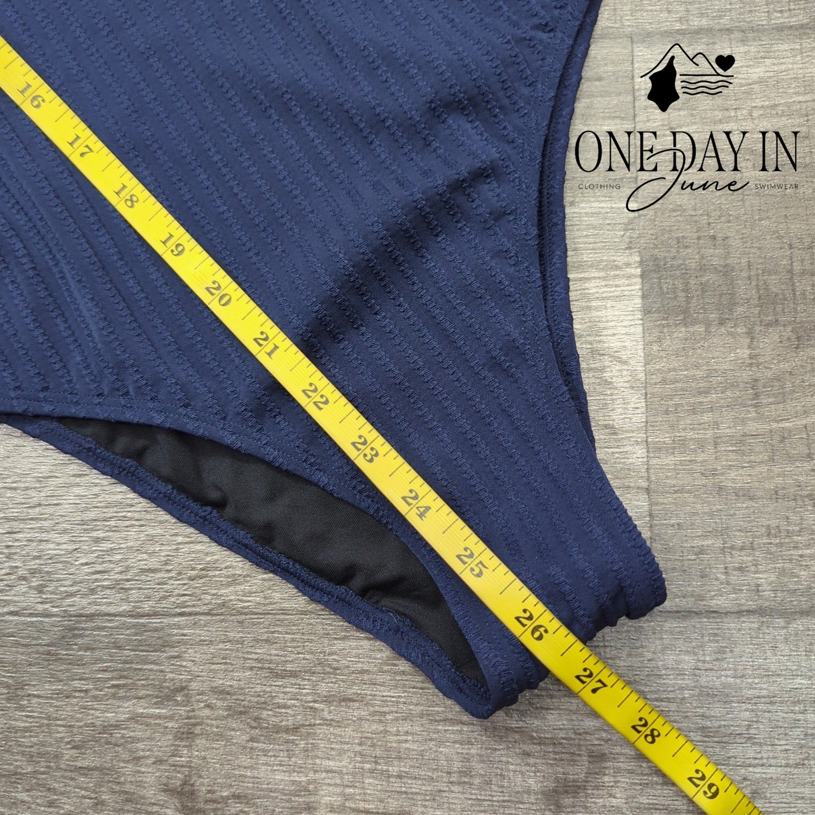 This blue beast of aquatic engineering strikes like lightning across the torso with its textured surface that catches light like a disco ball in a desert storm. The V-front design plunges with the confidence of a Vegas high-roller betting everything on red, while the polyester-spandex blend stretches and moves like liquid mercury against sun-kissed skin. Brand new with tags still attached, this one-piece miracle of modern swimwear construction promises to transform any pool party into a scene from some fever dream of summer perfection.