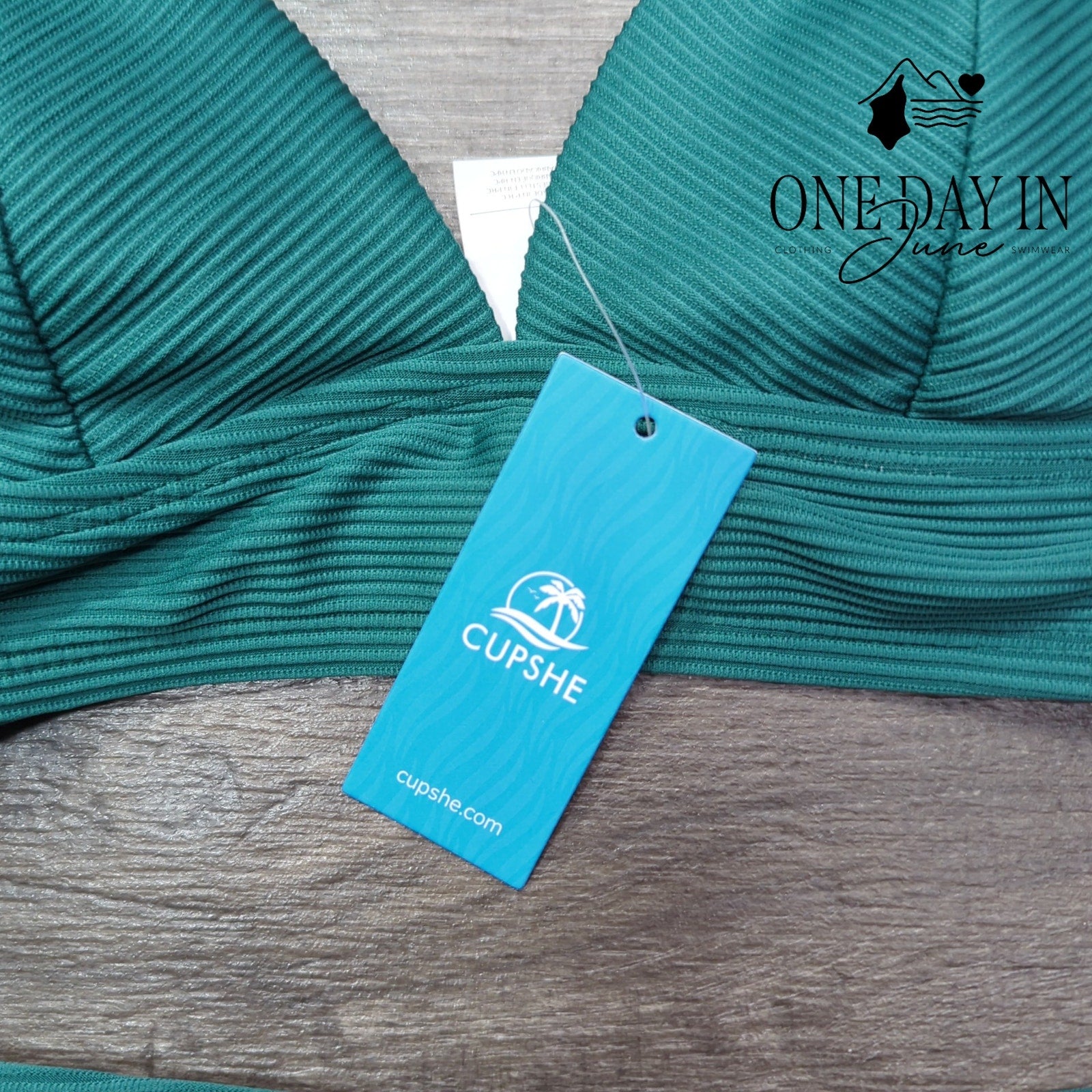 A most charming one-piece swimsuit from Cupshe, featuring an elegant V-neck design with ribbed detailing that would flatter any lady of discerning taste. The verdant green hue evokes the freshness of spring meadows, while the comfortable polyester and spandex blend ensures both propriety and ease of movement. This delightful garment arrives in pristine condition with tags attached, ready to accompany you on your most fashionable seaside adventures.