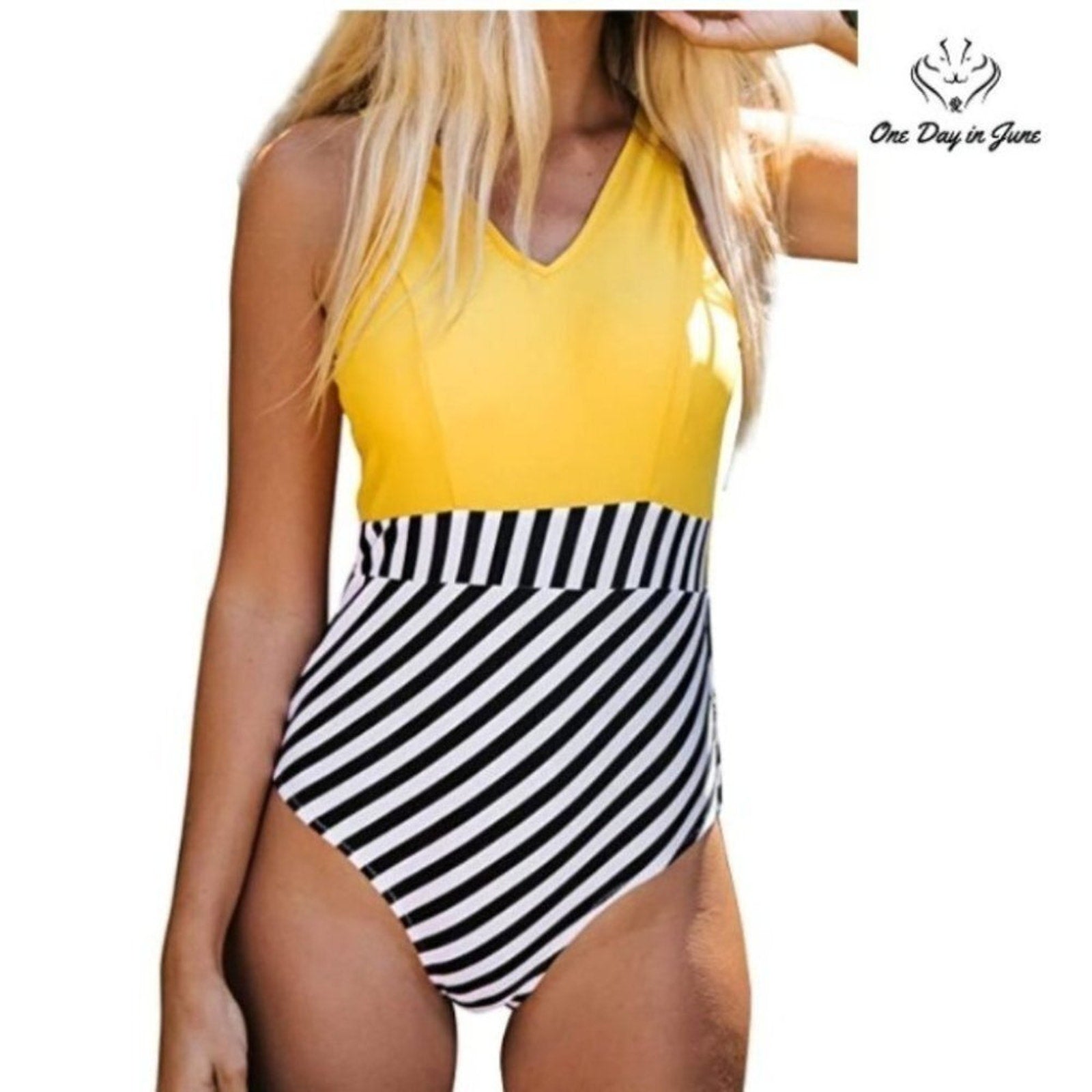 Cupshe Yellow V Neck and Striped Bottom One Piece Size XS