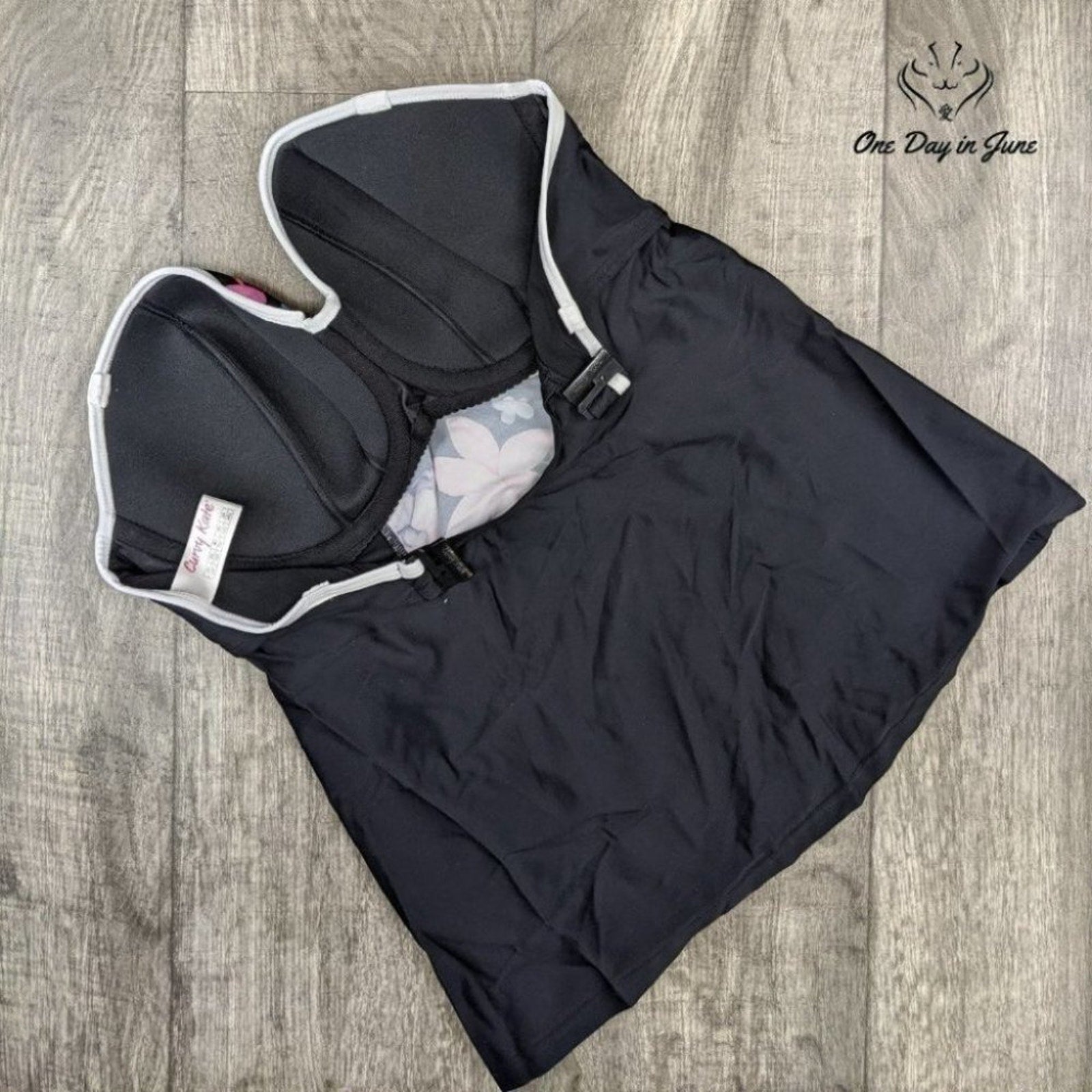 Dive into a kaleidoscopic frenzy of aquatic bliss with this Curvy Kate Tropicana bandeau tankini top. The black and pink swirl together like a fever dream of sun-drenched beaches and coconut rum, while the fabric clings to your curves like a second skin forged in some distant Polynesian paradise. This isn't just swimwear, it's a ticket to ride the wild surf of your imagination, a passport to the outer limits of poolside panache.