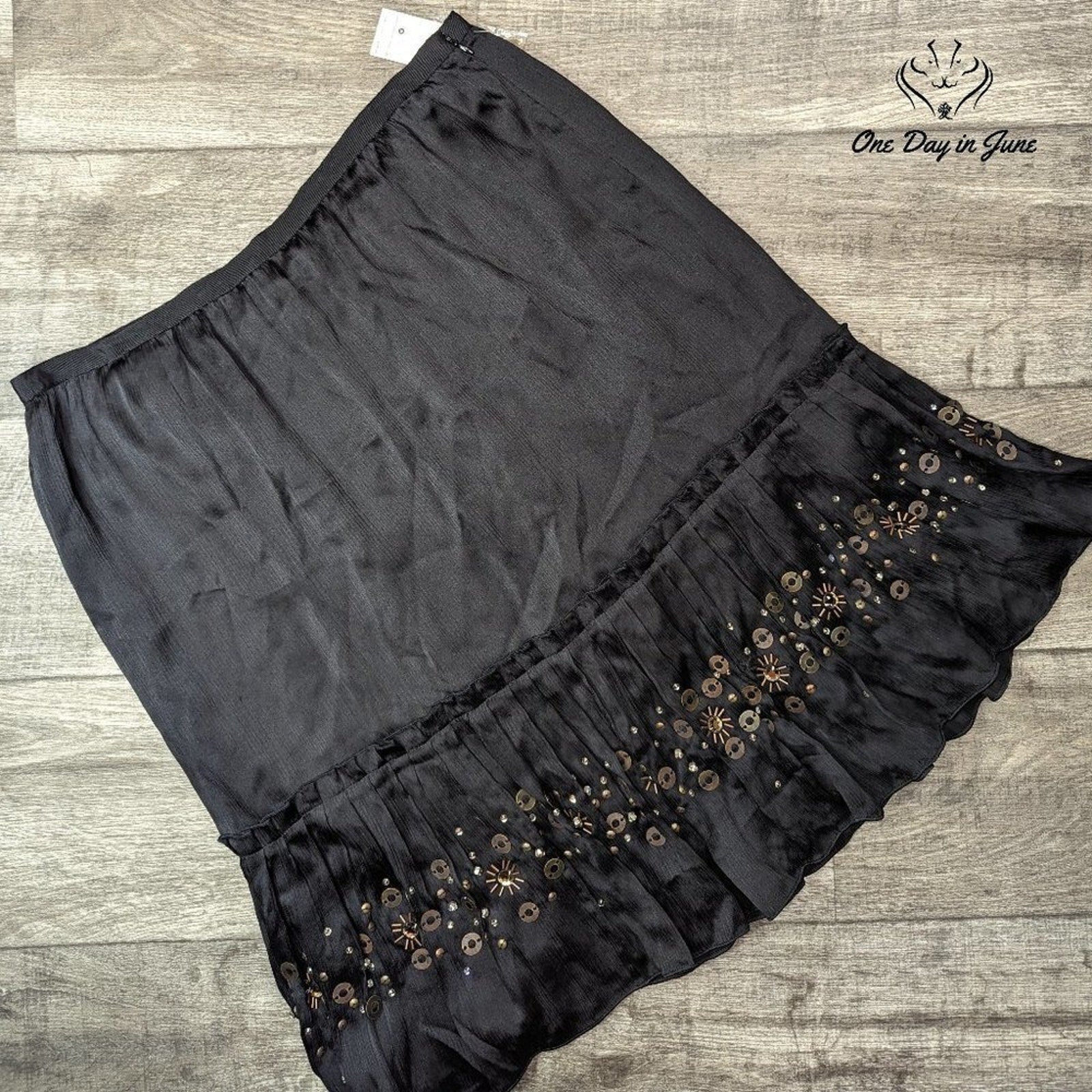 Introducing a new, enchanting garment from the esteemed house of Dana Buchman - a splendidly beaded silk skirt, lined for comfort, in the timeless shade of black. This ethereal creation, brimming with elegance and sophistication, is certain to make any lady of the town or gentry feel like the belle of the ball.