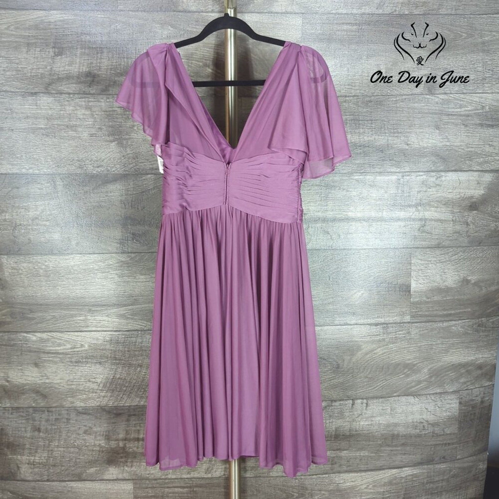 A vision in purple, this enchanting mini dress from David's Bridal captivates with its delicate mesh sleeves. Crafted from lustrous polyester, it shimmers like twilight on the Seine, promising nights of champagne-fueled revelry and whispered secrets.