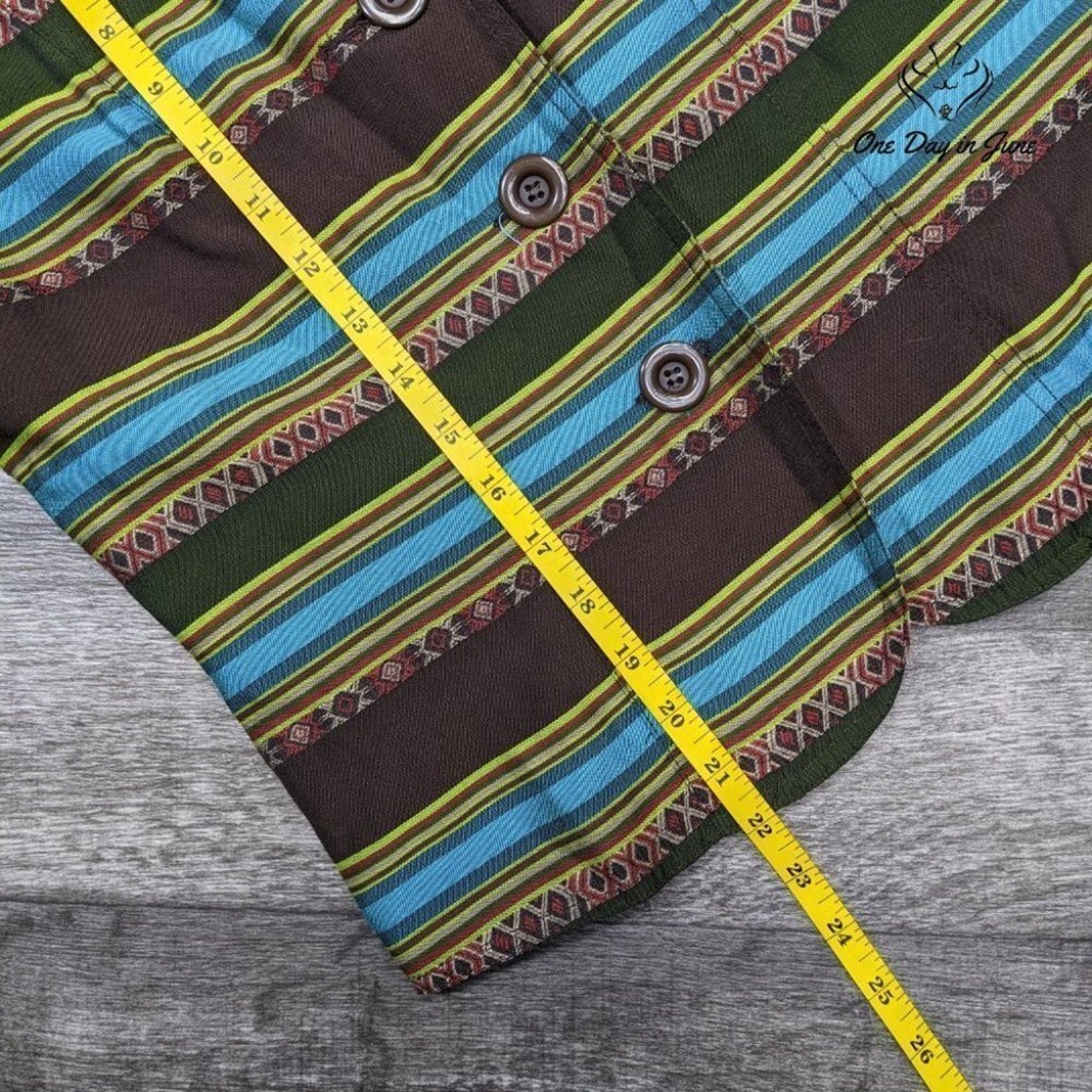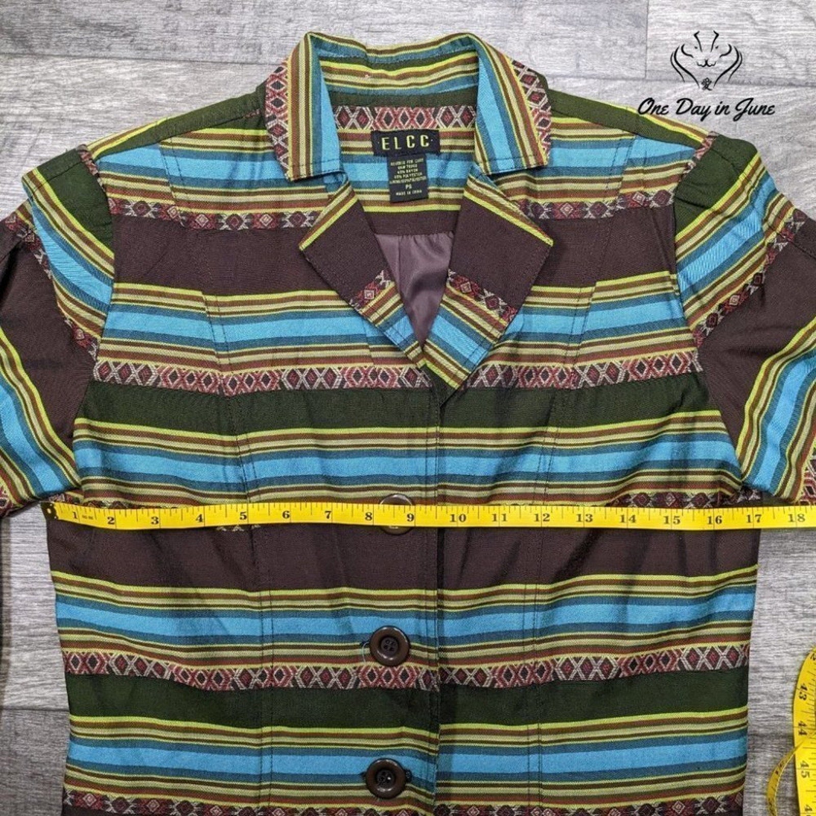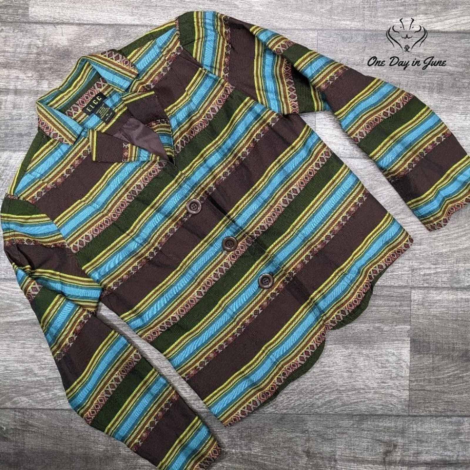 A most agreeable blazer in charming multi-hued tones, featuring a handsome button front closure that speaks to both propriety and style. Crafted from a pleasing blend of rayon and polyester, this jacket presents itself in like new condition, ready to accompany any lady of fashion through her daily pursuits with grace and confidence.