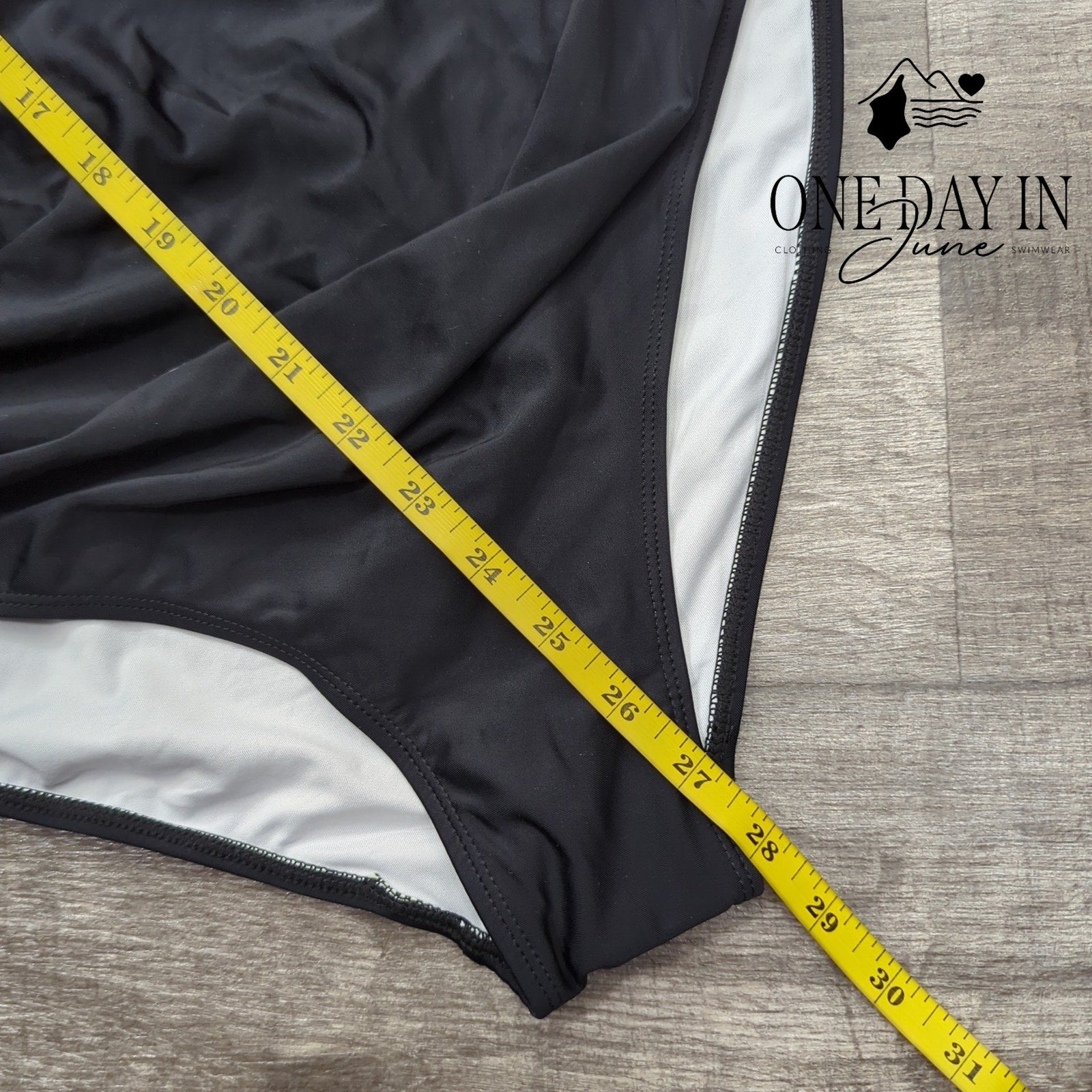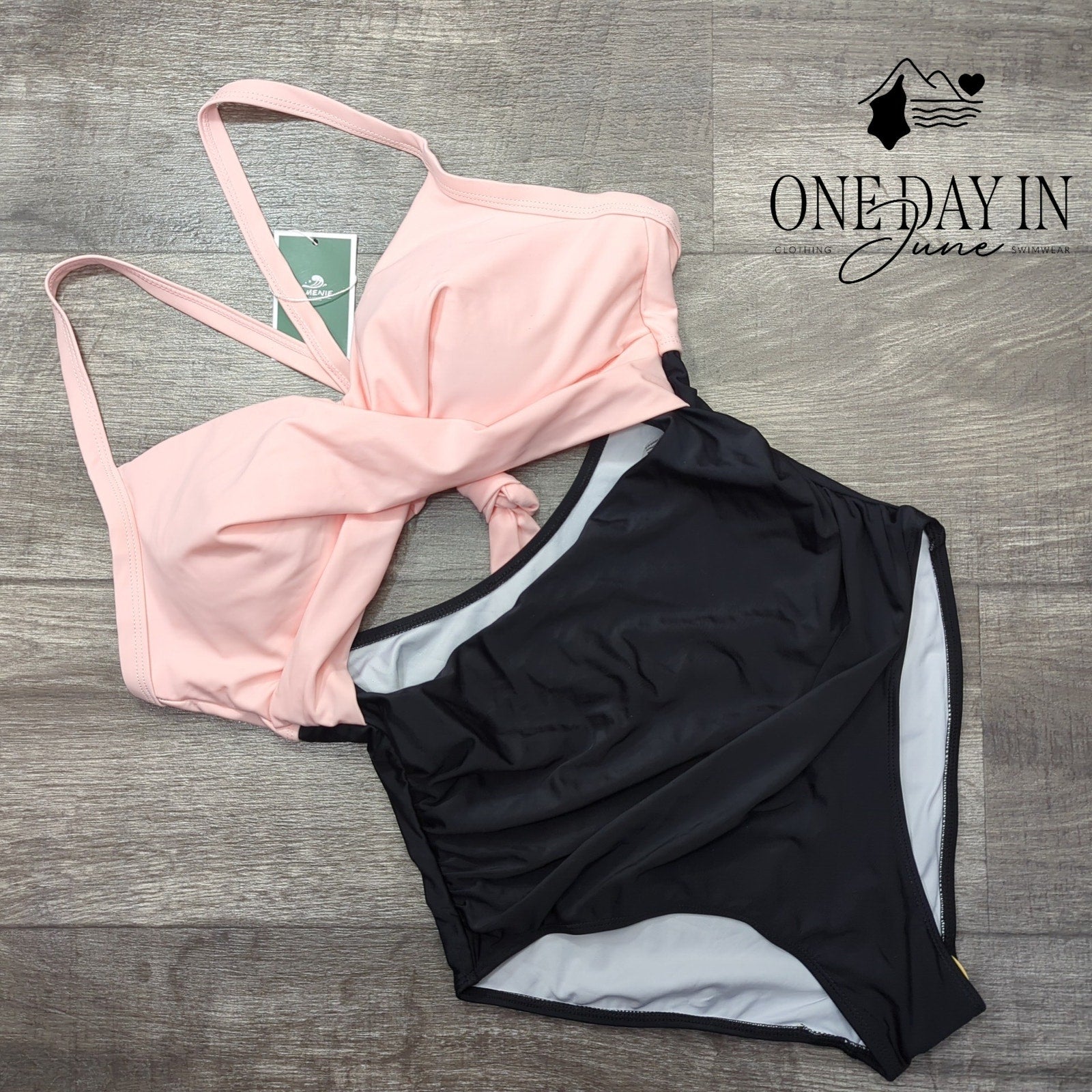 This sassy swimsuit is quite a sight, with cross front cutouts done just right! Black as night and oh so sleek, it's the perfect piece for your beach boutique!