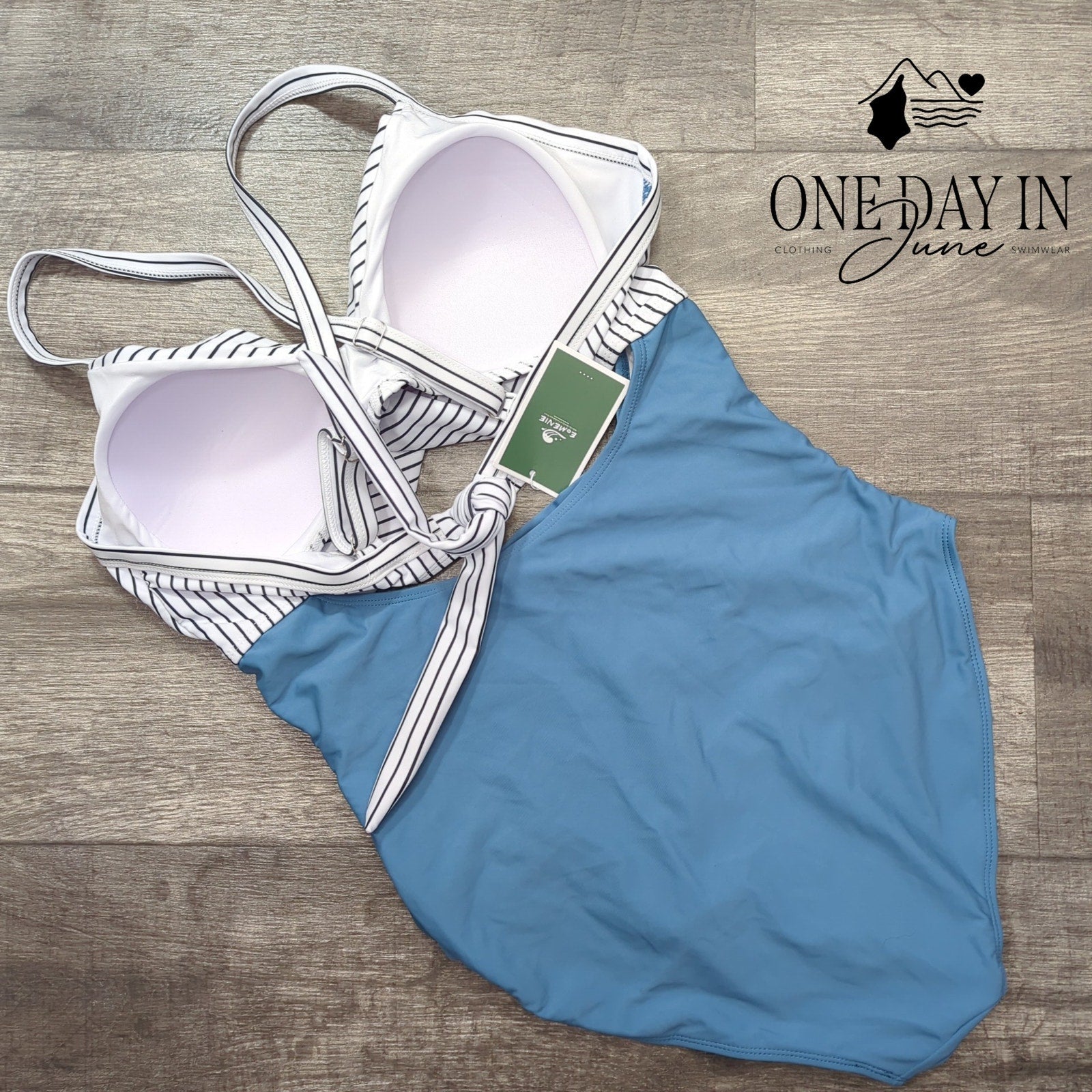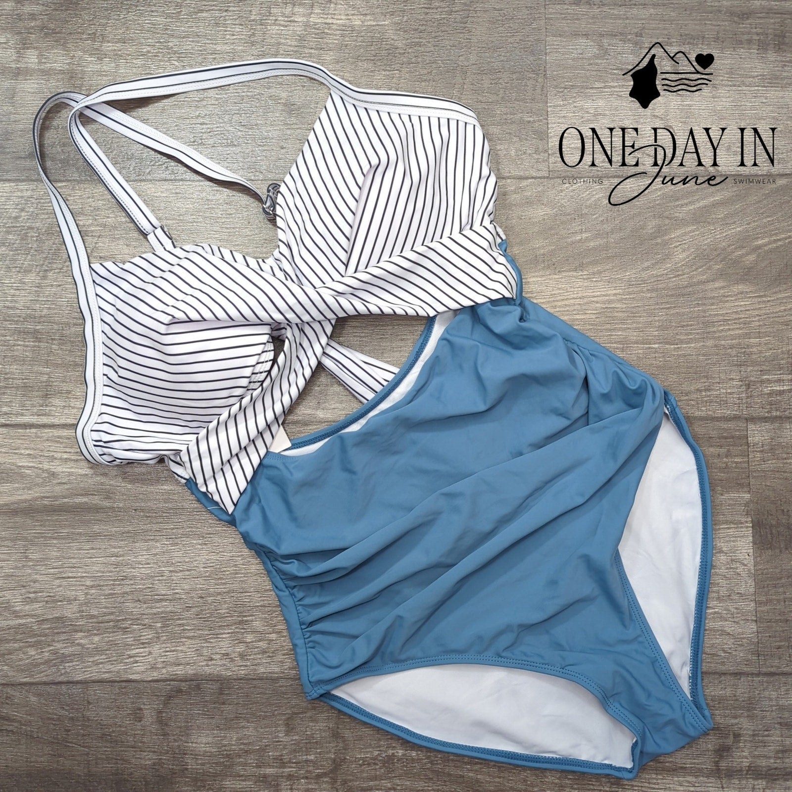 A most becoming one-piece in the most agreeable shade of blue, featuring a delightfully modern cross-front design with artful cut-out details that would surely turn heads at any seaside gathering. The clever construction of polyester and spandex ensures both comfort and a most flattering silhouette for the discerning lady. This charming piece arrives in pristine condition, ready to accompany you on your next aquatic adventure with all the confidence of a true heroine.