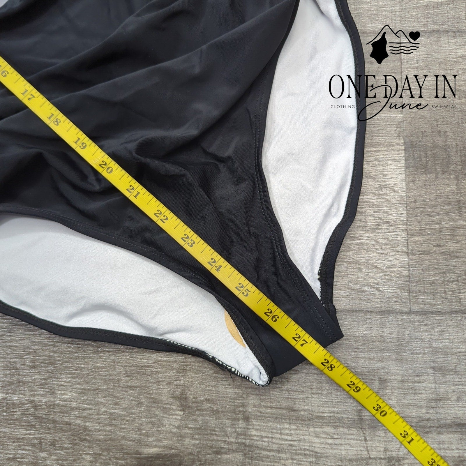 Oh my stars, what a suit so divine, with a cross-front cutout that's simply sublime! Tie it up in the back with a bow oh-so-neat, this black beauty will make your beach look complete!