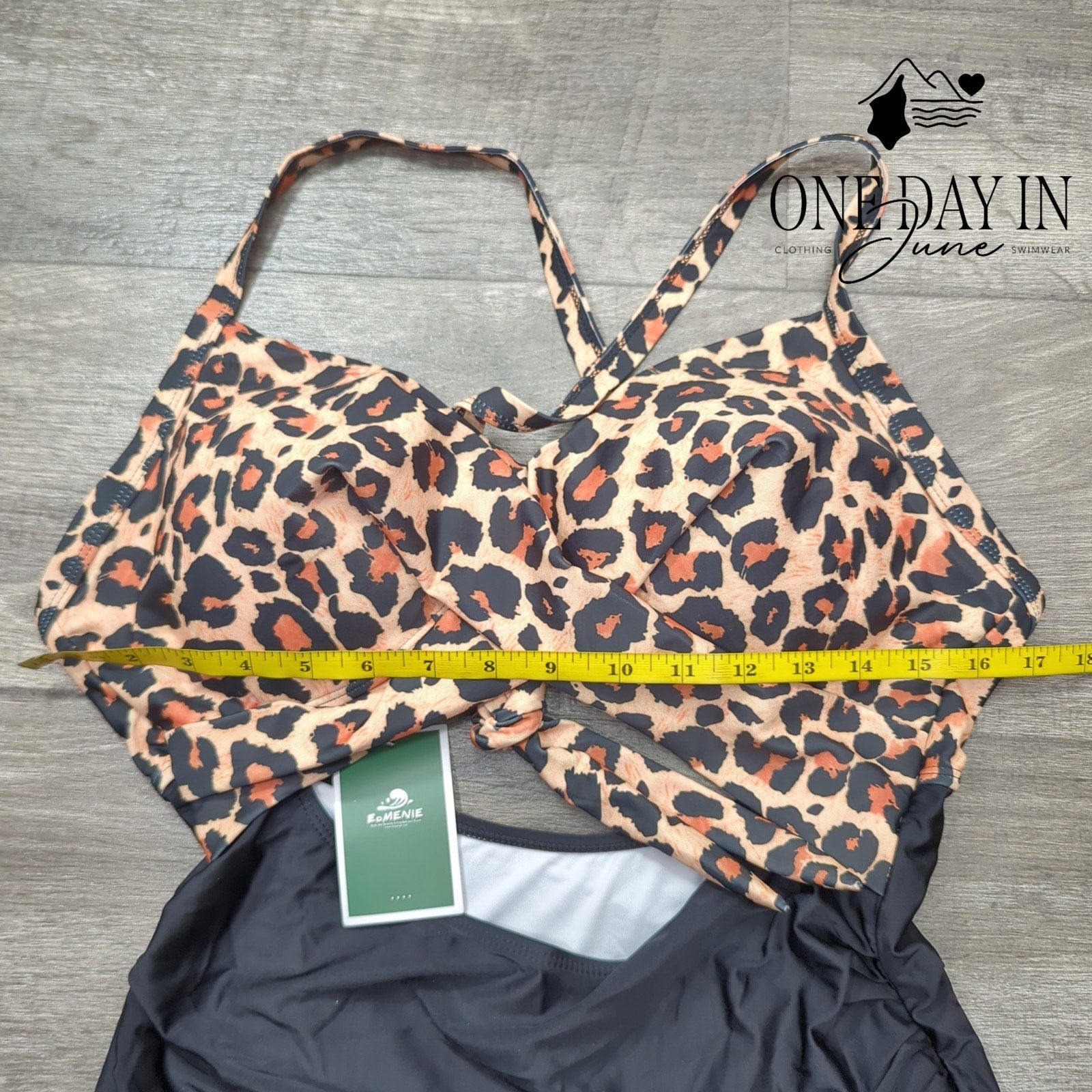 Oh my stars, what a suit so divine, with a cross-front cutout that's simply sublime! Tie it up in the back with a bow oh-so-neat, this black beauty will make your beach look complete!