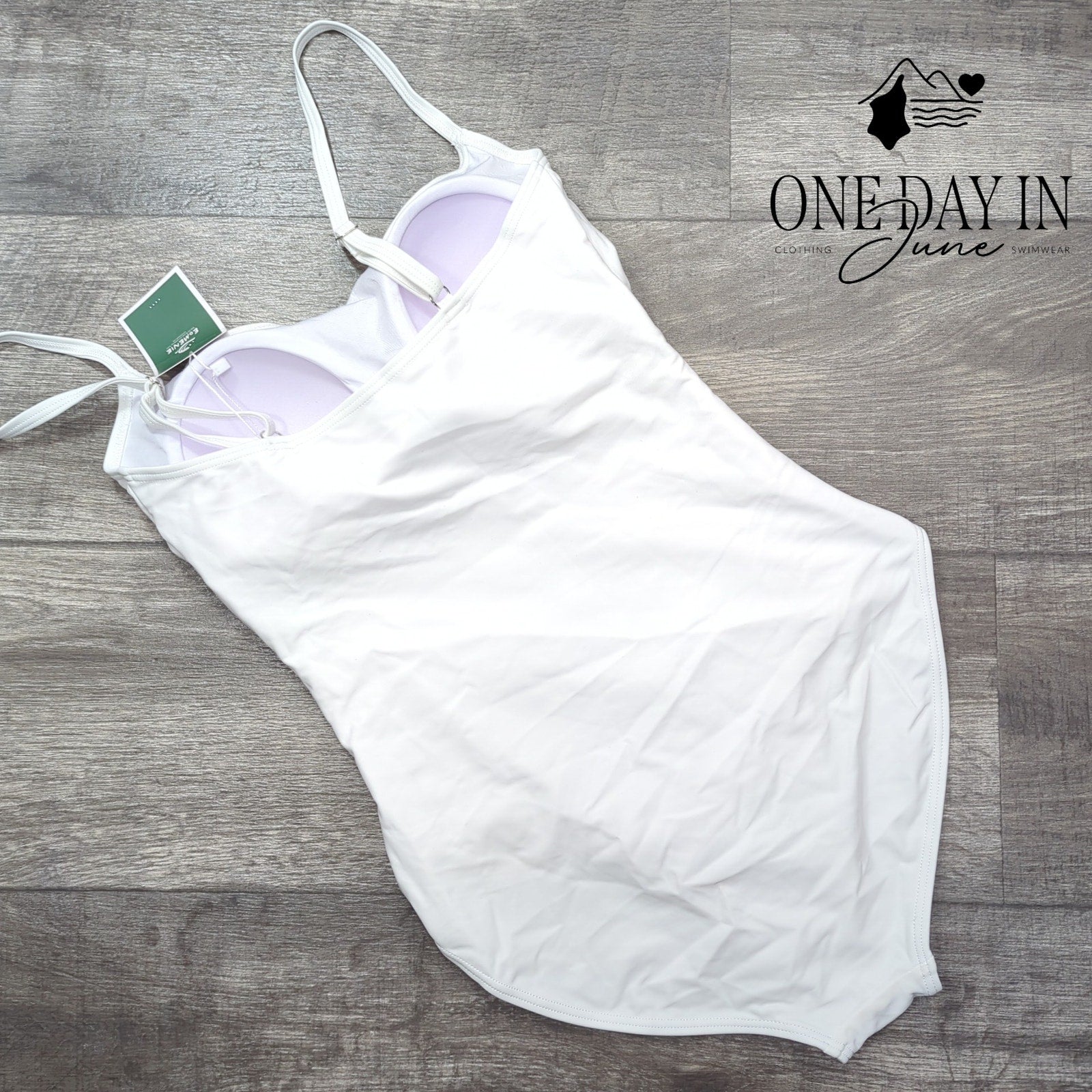 This sleek white number cuts through the chaos of summer poolside madness like a chrome-plated torpedo, engineered with tummy-taming technology that'll have you feeling like you just conquered the Nevada desert in a Cadillac convertible. The polyester-spandex blend moves like liquid mercury against your skin, promising comfort that endures through whatever savage poolside adventures await. Brand new with tags still attached, this aquatic armor is ready to transform any ordinary swimming experience into a full-throttle plunge into pure, unadulterated confidence.