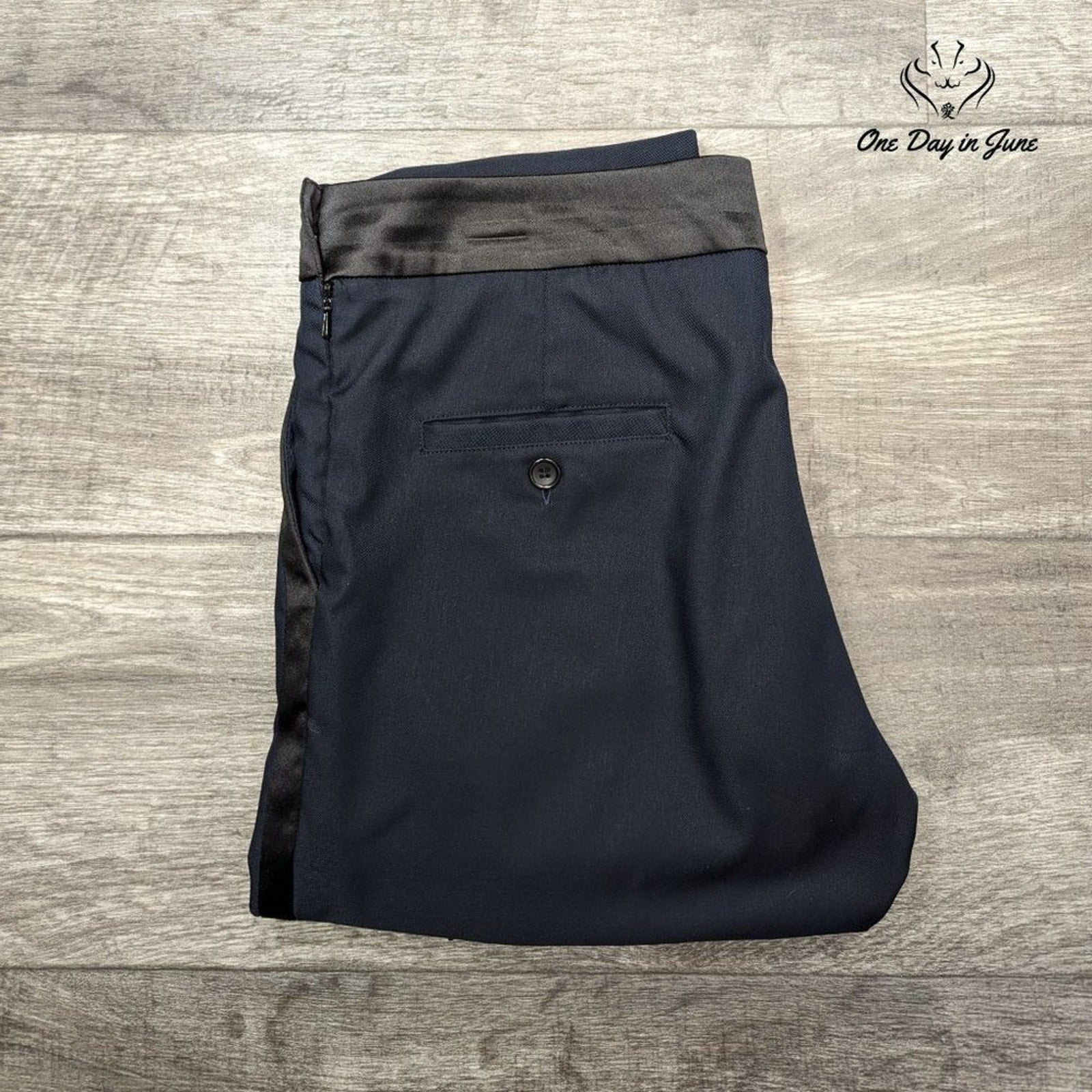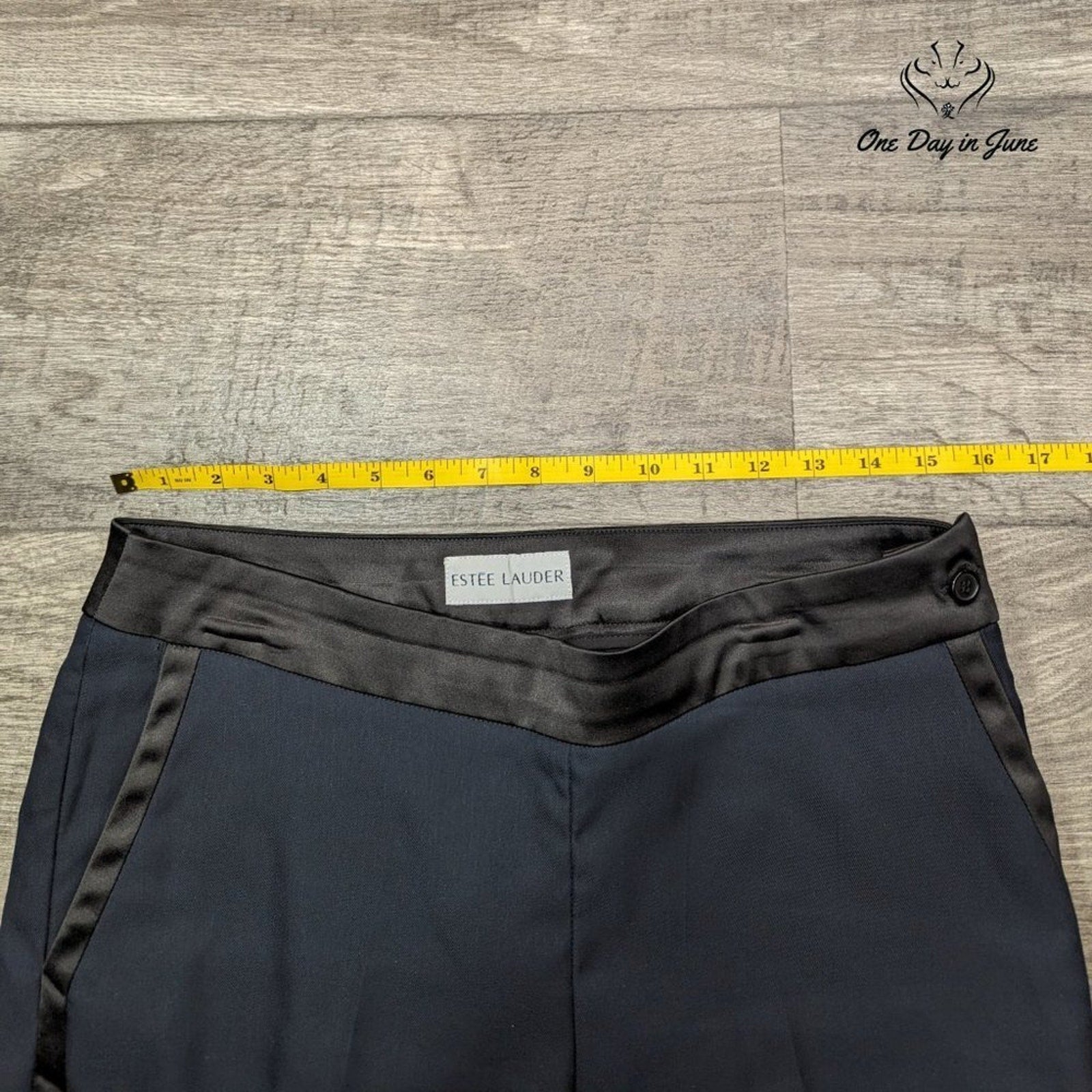 These Estee Lauder dress pants sing a silent song of elegance. Dyed a rich navy, the polyester fabric drapes like a soft morning fog. They are like new, having lived more in the closet than the world.