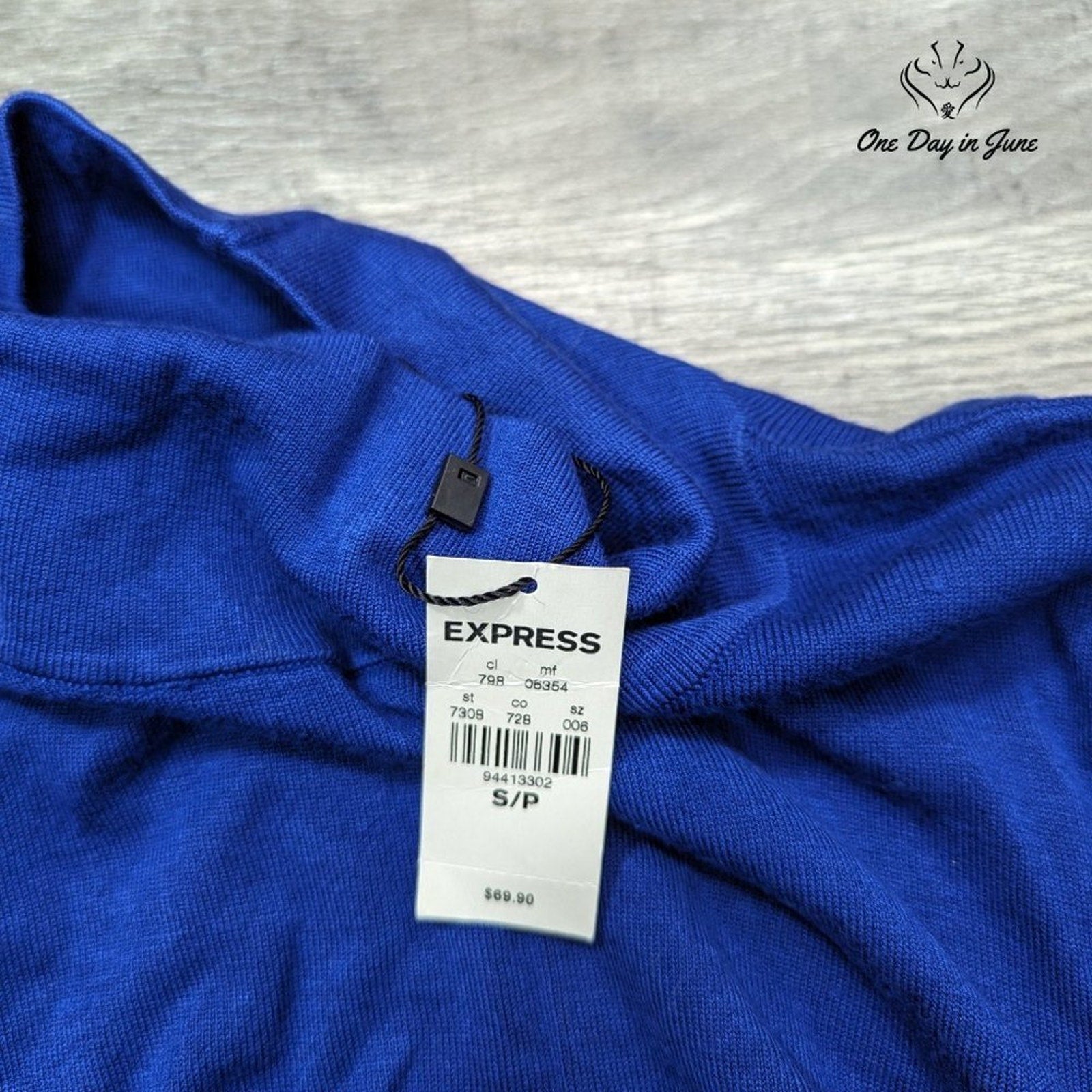 A most elegant blue turtle neck dress from Express, fashioned with long sleeves to provide both warmth and refinement for the discerning lady. This charming frock, crafted from a pleasing blend of rayon, nylon, and spandex, offers the comfort of a favourite sweater whilst maintaining the graceful silhouette of proper dress. New with tags, it awaits its fortunate wearer with all the promise of a delightful addition to any gentlewoman's wardrobe.