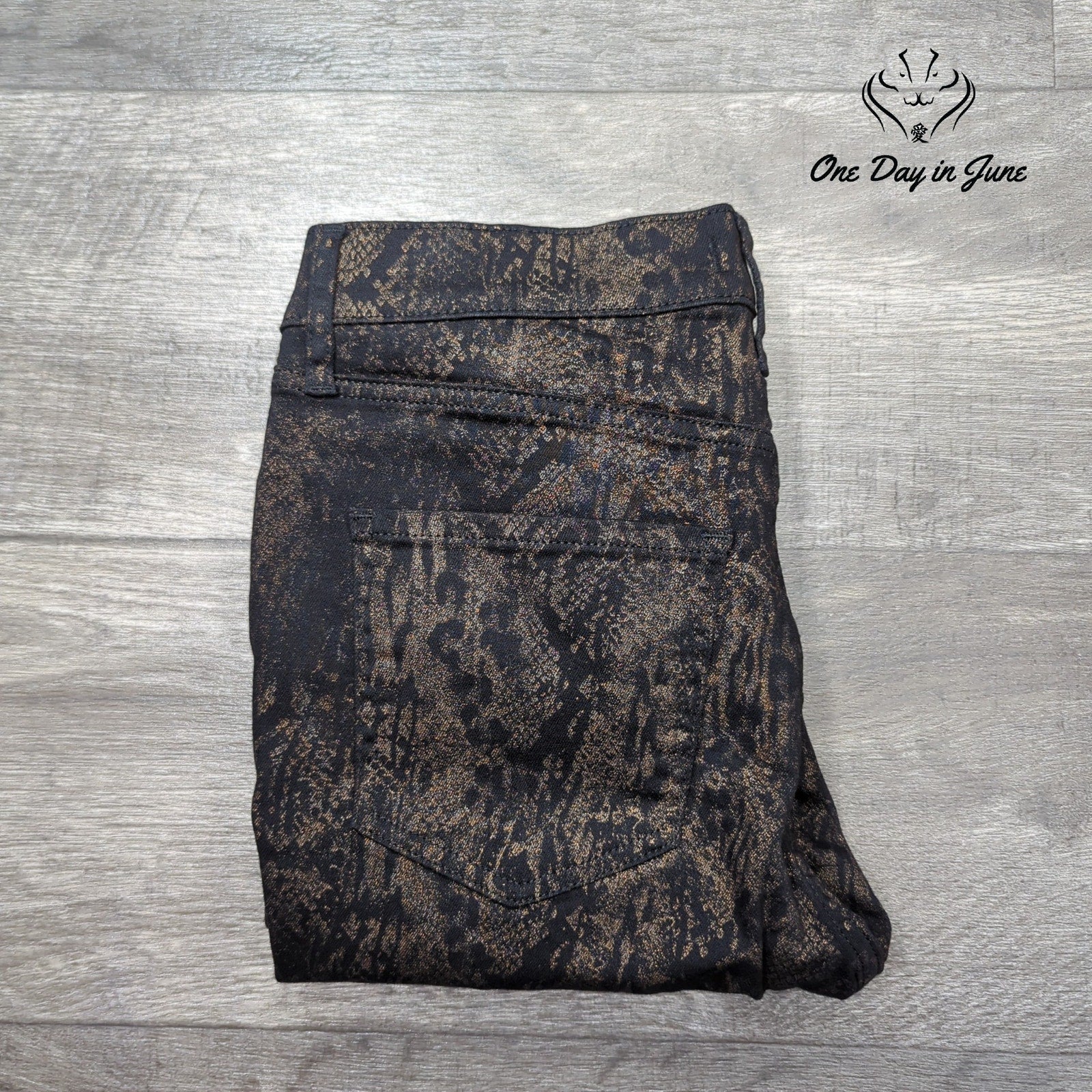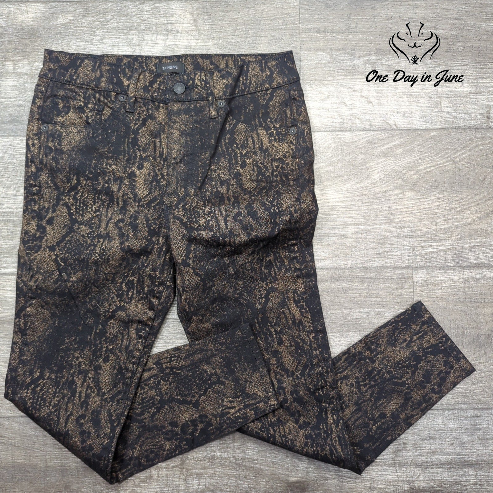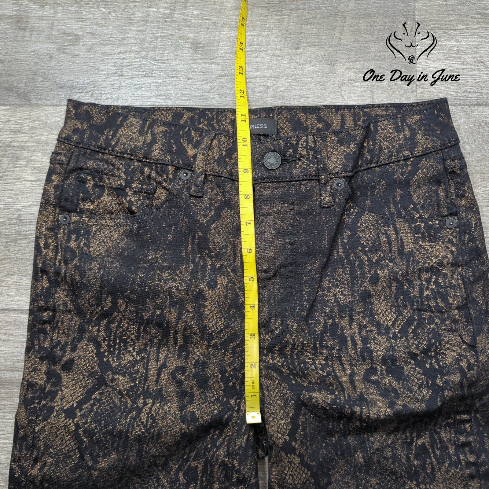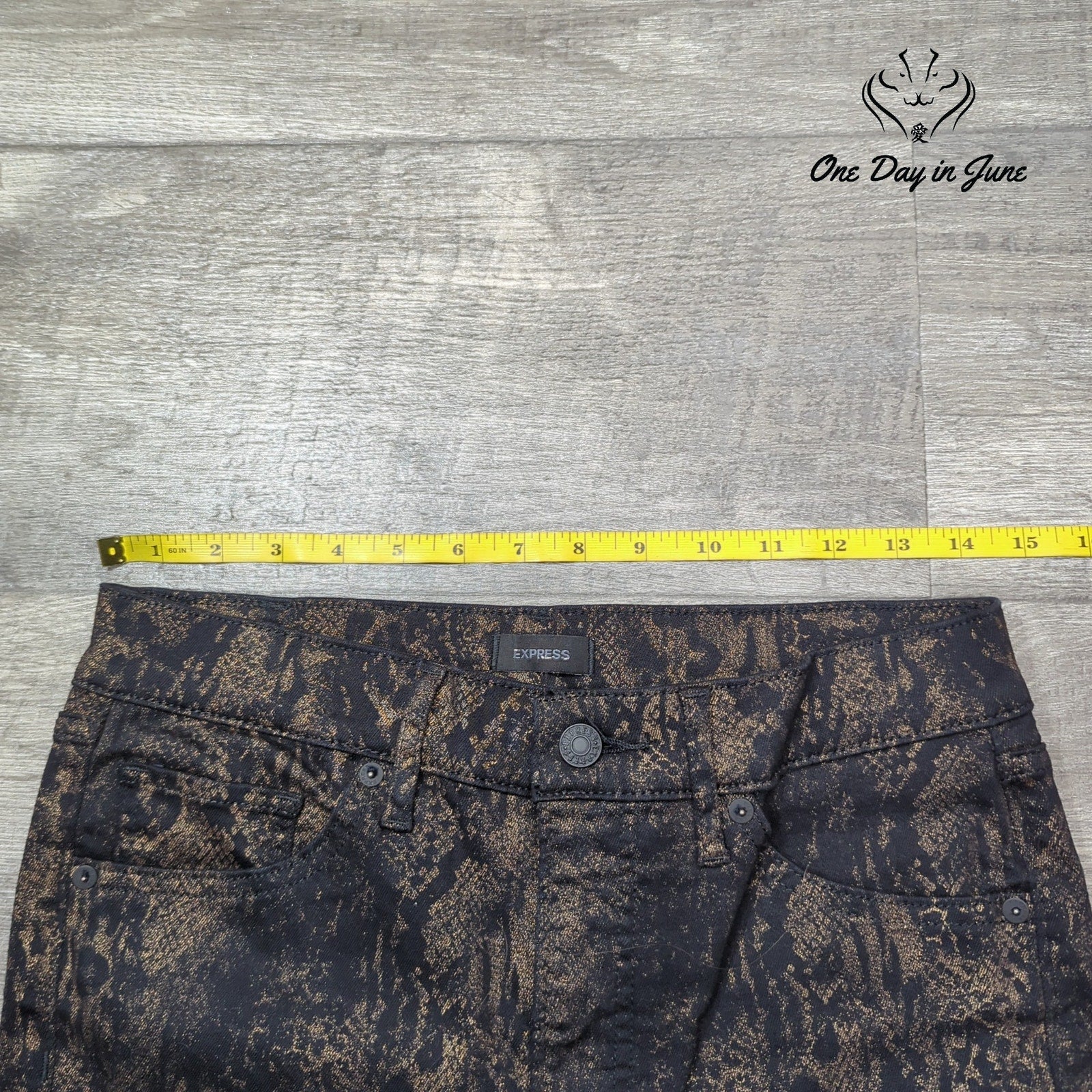 A most becoming pair of Express mid-rise skinny jeans in a delightful brown-black hue, crafted with the finest cotton and a touch of spandex for the most flattering fit imaginable. These impeccably maintained trousers, in a condition that suggests they have scarcely been worn, will serve as a most practical addition to any discerning lady's wardrobe.