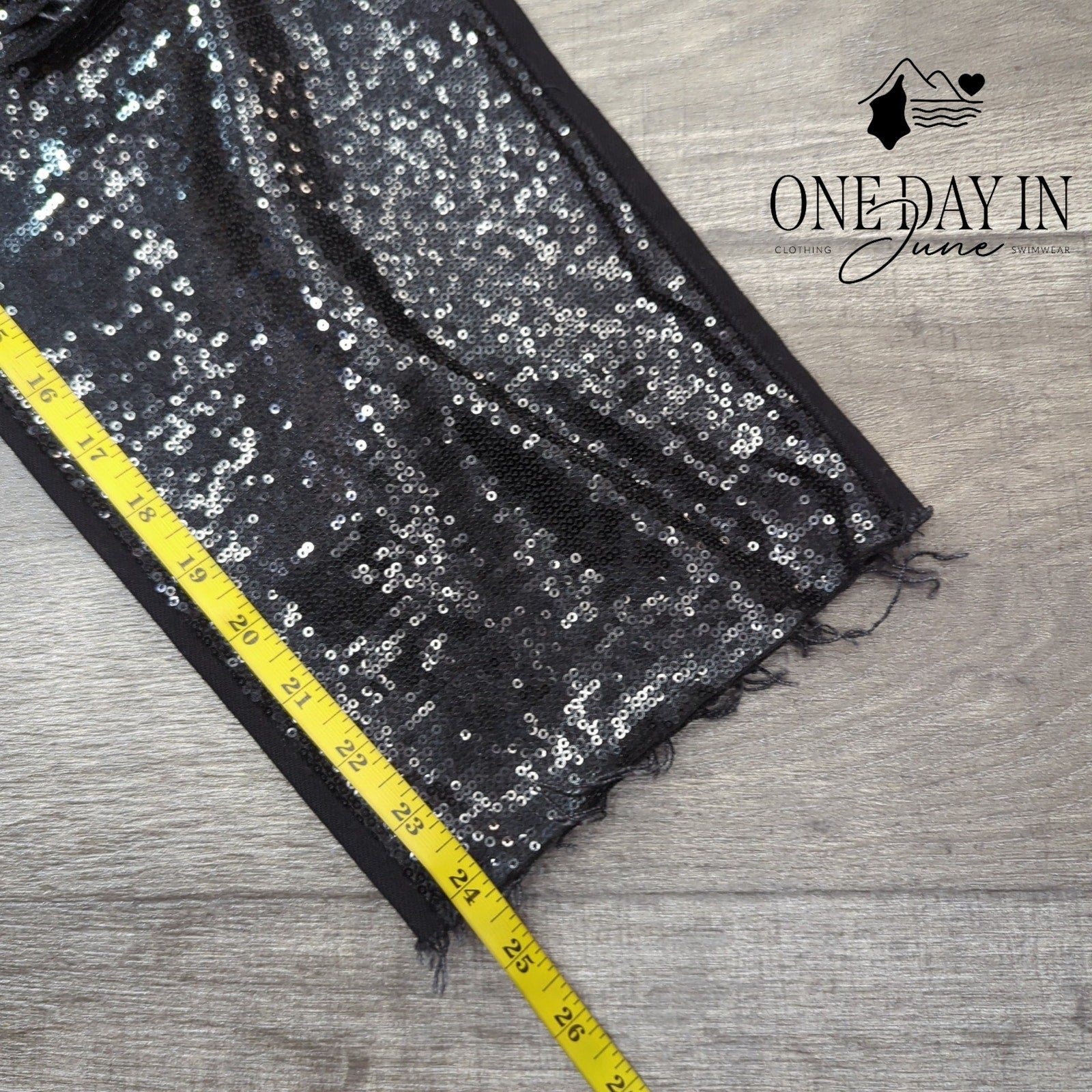 These sparkly black jeans will make you shine and gleam, with sequins that twinkle like a dazzling dream! From waist to ankle they fit just right, making every step a pure delight!