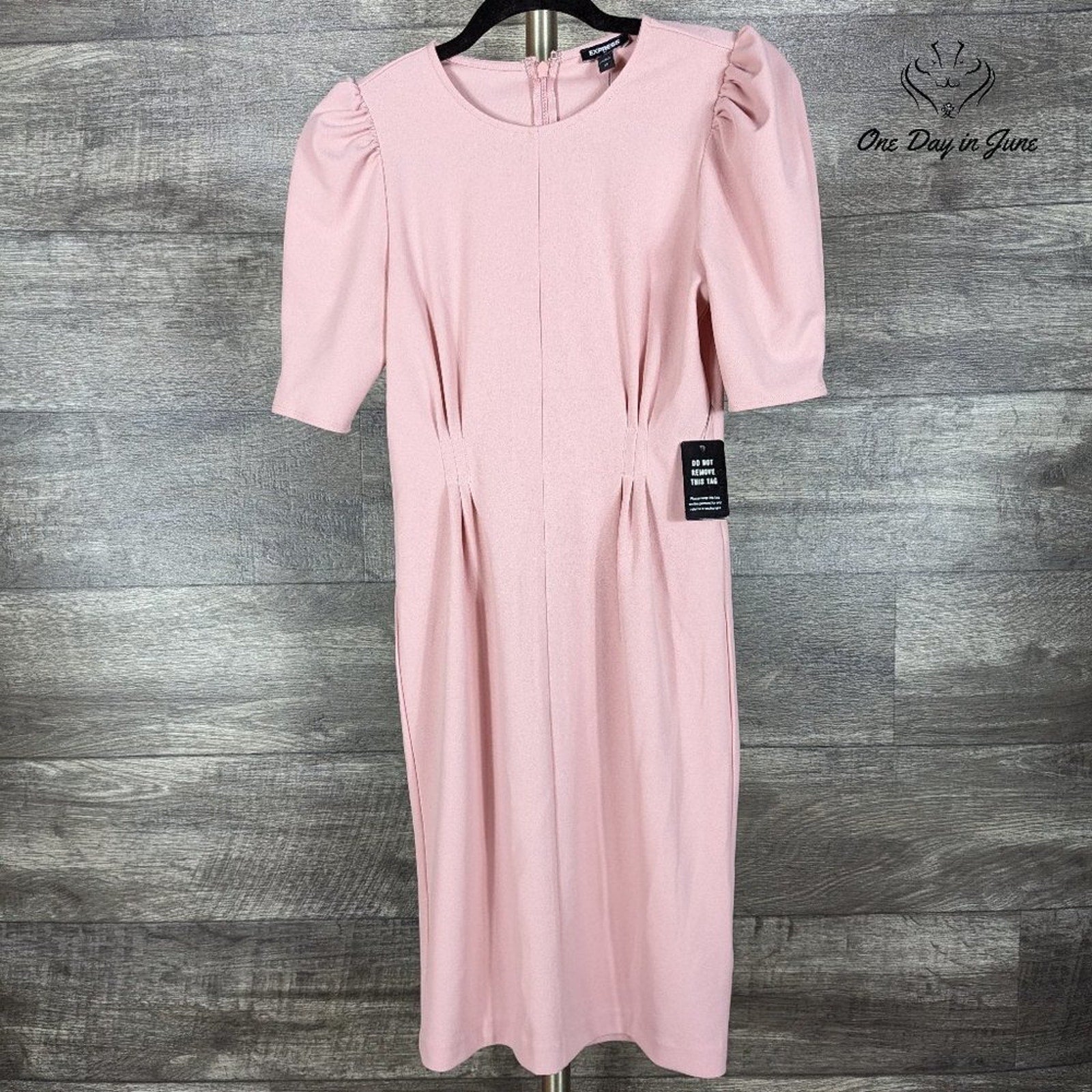 Bathe yourself in a symphony of color, a pink crescendo of polyester and spandex ecstasy, lovingly woven by the mad tailors at Express. This is not just a dress, it's an invitation to a dance, a short-sleeve ballet of fashion and fancy, untouched by the ravages of time, still clinging to its original tags like a newborn to its mother. Step into the spotlight, the world is your stage and this, dear lady, is your costume.