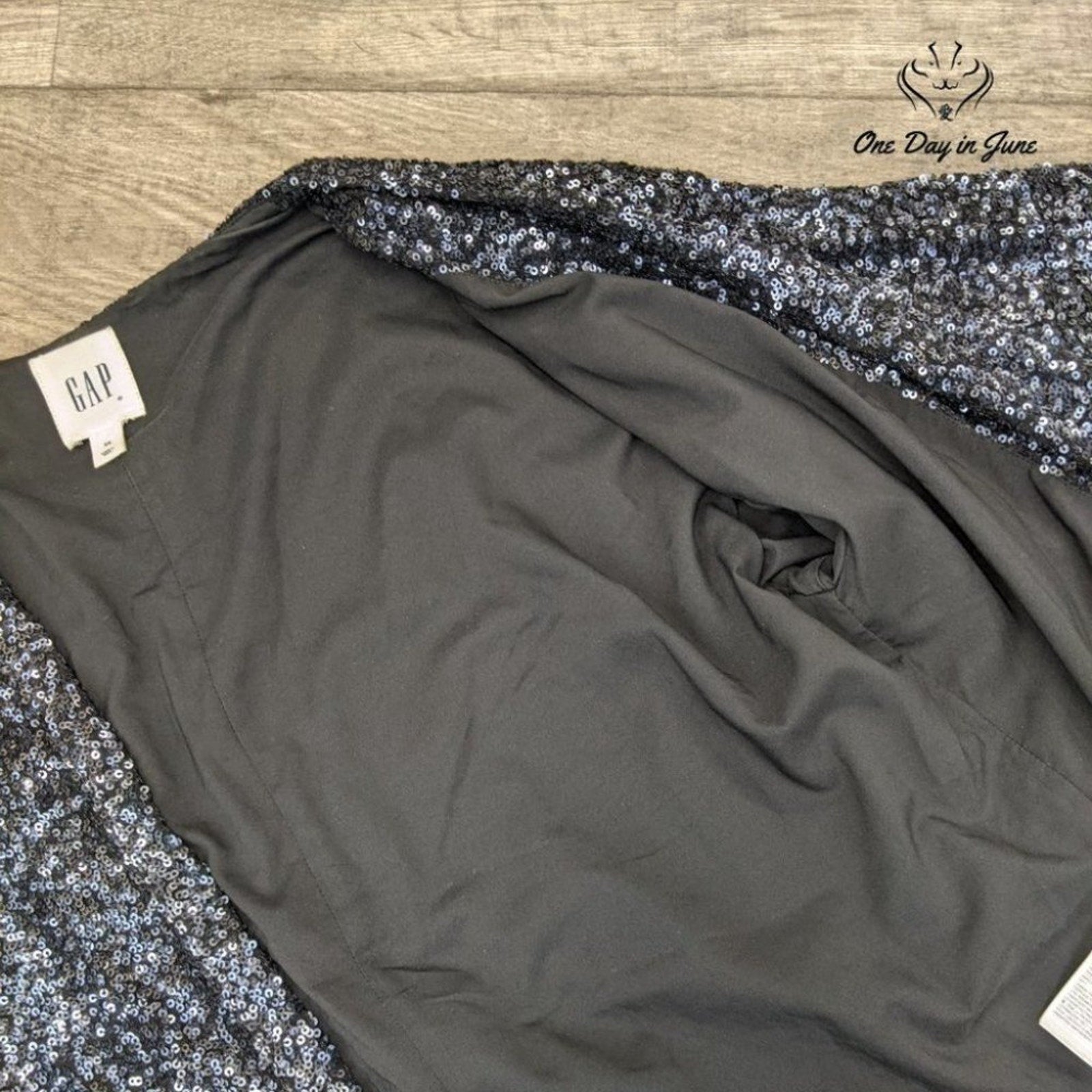 A dazzling obsidian dream, this loose-fitting sequin blazer from Gap captures midnight elegance with every shimmer. Long sleeves frame a silhouette that moves with jazz-age fluidity, transforming the mundane into something magnificent—a garment worthy of West Egg's most luminous soirées.