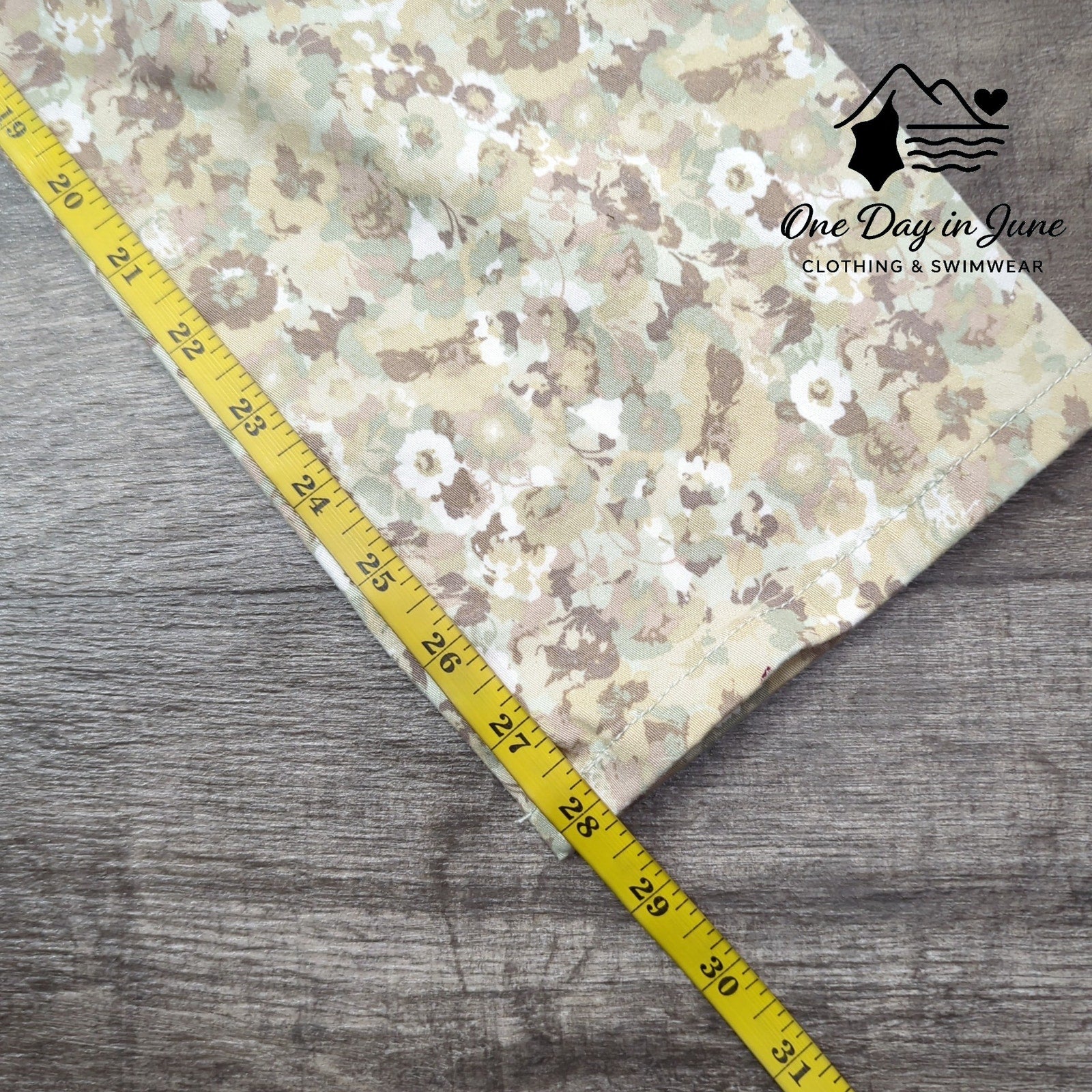 A delicate dance of floral patterns adorns these tan Amanda 2.0 slim leg jeans from Gloria Vanderbilt. With their classic rise silhouette and cotton-elastane blend, they promise both elegance and comfort for the modern woman. Brand new, tags still clinging like memories of a forgotten summer evening.