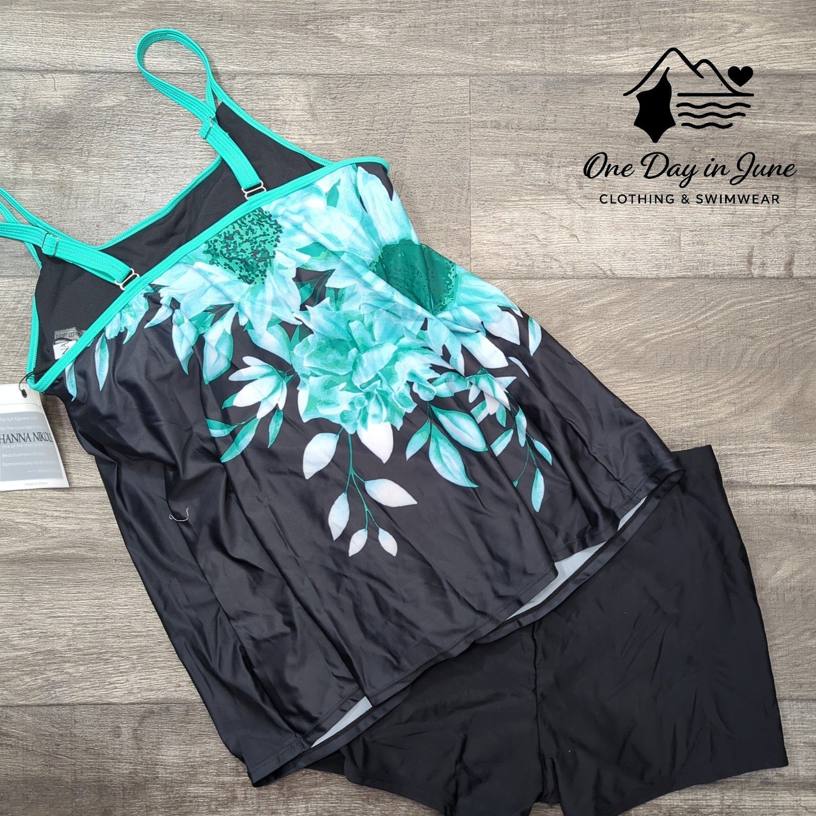 With a splash of green and black floral flair, this tankini's ready for fun beyond compare! Boyshort bottoms complete this Hanna Nikole swimwear, brand new with tags for your swimming affair!