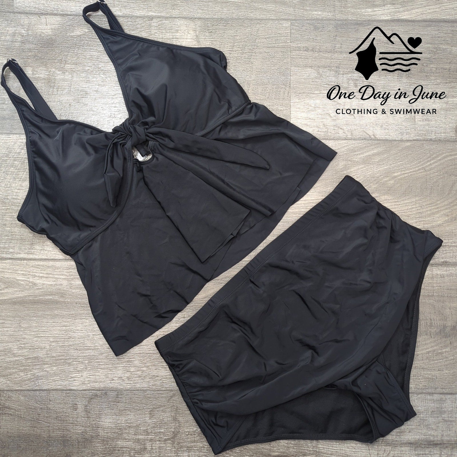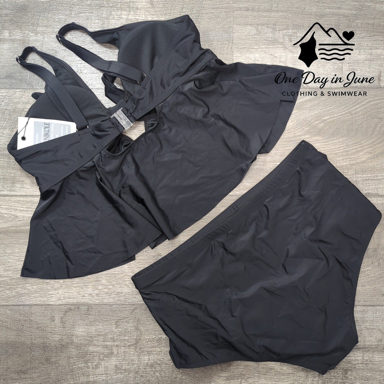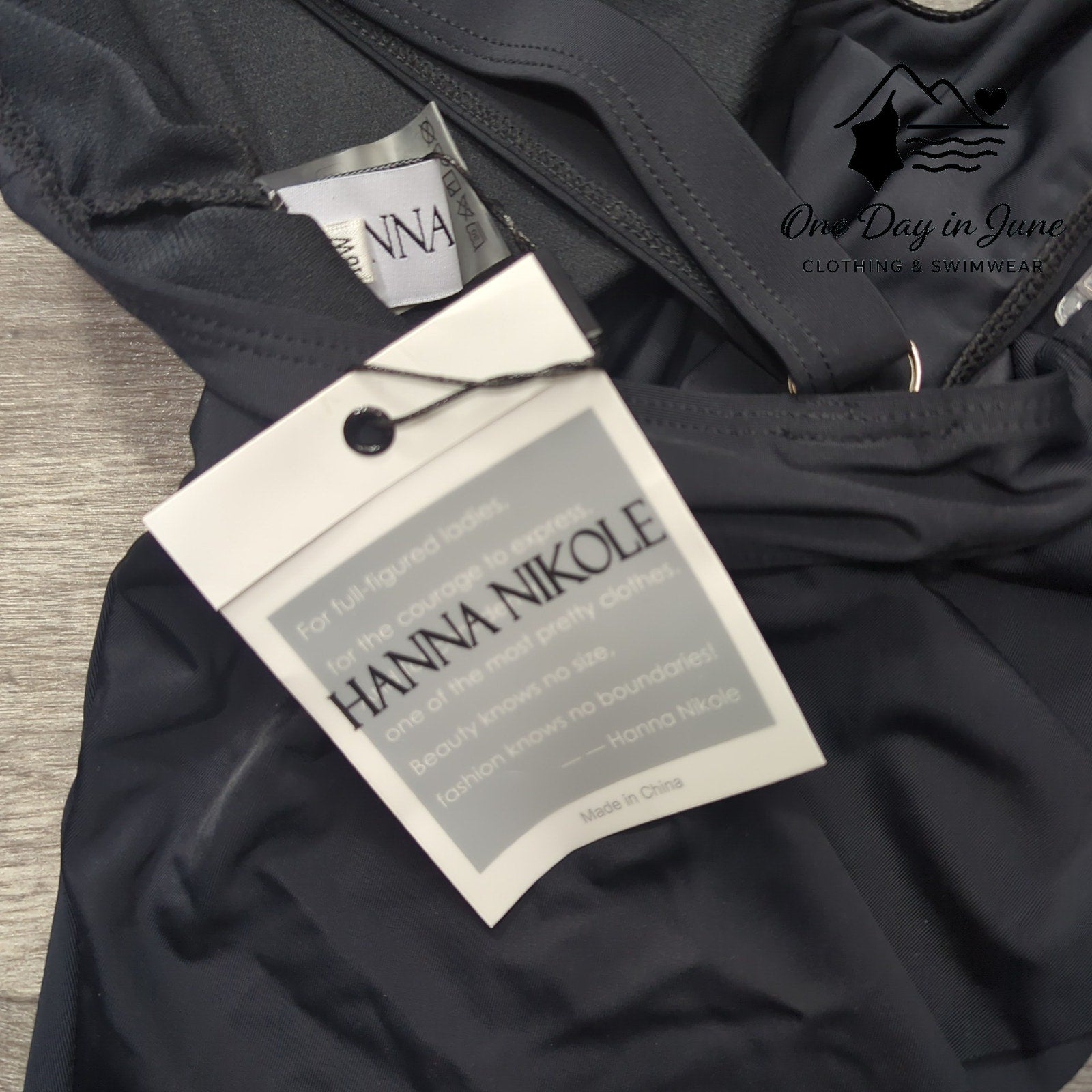 This fabulous swimsuit with a keyhole and flounce has style, yes indeed, with a knot in the front that's sure to succeed! The black bikini from Hanna Nikole is new with its tags, perfect for swimming or just catching sun rays!
