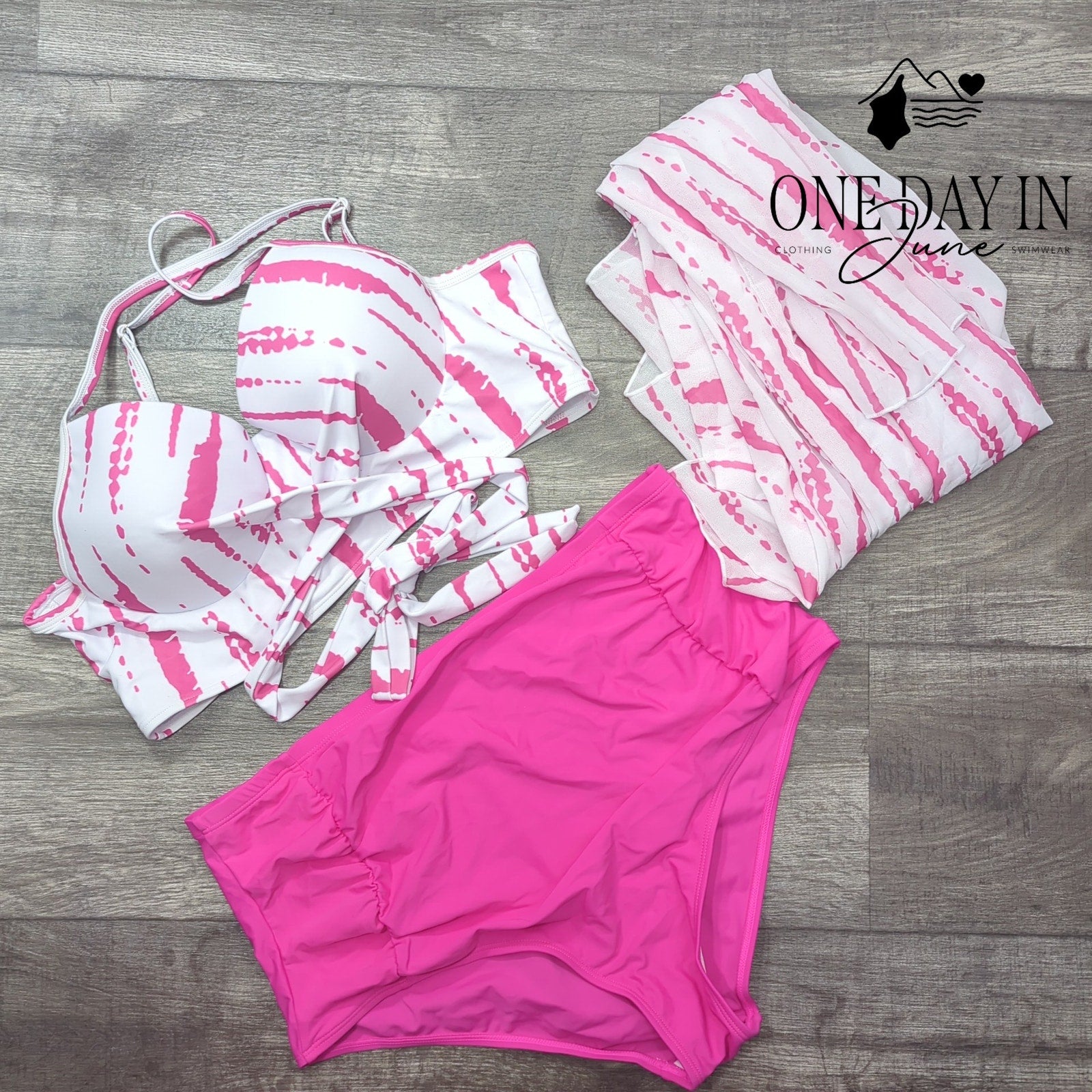 This pretty pink bikini will make you shine so bright, with molded cups and high waist fit that's just right! Three fantastic pieces in a set so sweet, perfect for poolside fun or beach retreat!