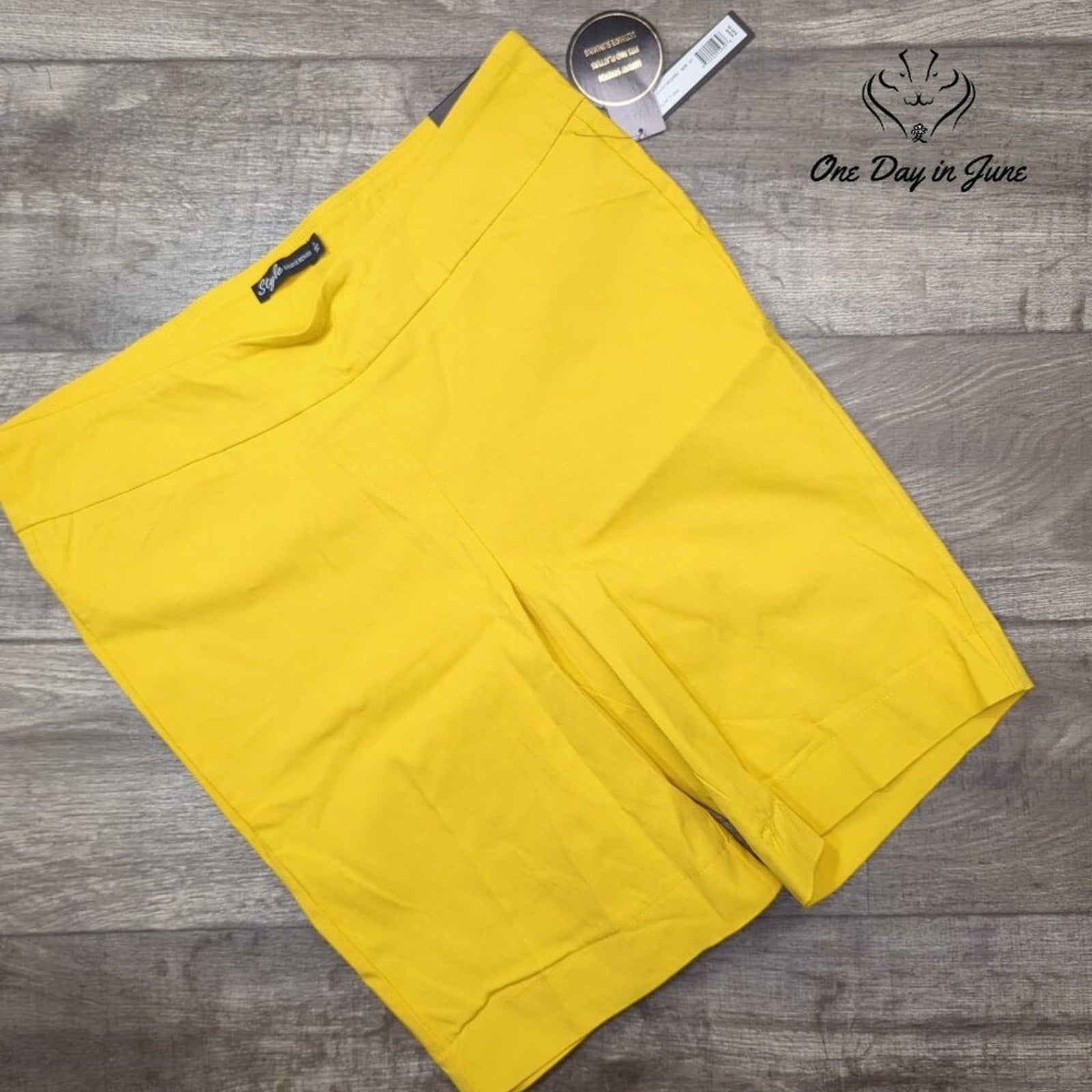 These charming yellow shorts from harve' benard offer both comfort and elegance for the discerning lady. The slimming 360 stretch design ensures a most flattering silhouette, while the pull-on style provides ease and convenience for those busy summer days. Crafted from a delightful blend of rayon, nylon, and spandex, these shorts promise to be a treasured addition to any gentlewoman's wardrobe.