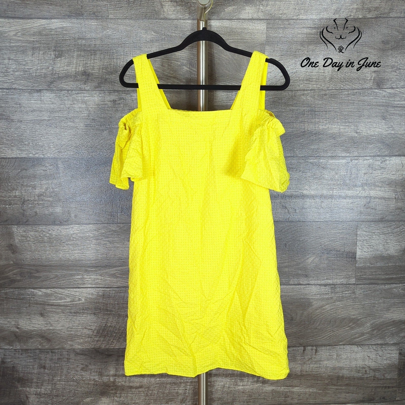 The savage yellow beauty of this J.Crew mini dress beckons like a desert sun, with cold-shoulder cutouts that scream rebellion against conformist fashion norms. A cotton-viscose blend that flows like butter across the skin, with a polyester lining that keeps your secrets safe - this is what the good life feels like when you're dancing through the night in a fever dream of style and sophistication.