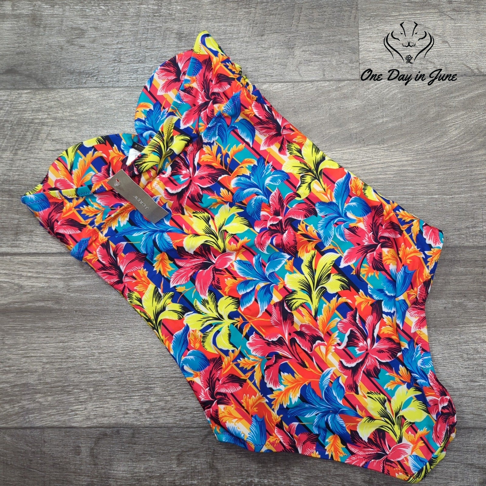 Behold, a most enchanting swimsuit from the esteemed J. Crew, designed to grace the form of any elegant lady. This strapless one-piece garment boasts a charming cross-front design, adorned in a delightful array of hues that shall surely turn heads at any seaside gathering. Crafted from a blend of nylon and spandex, it promises both comfort and a flattering silhouette for those leisurely afternoons by the shore.