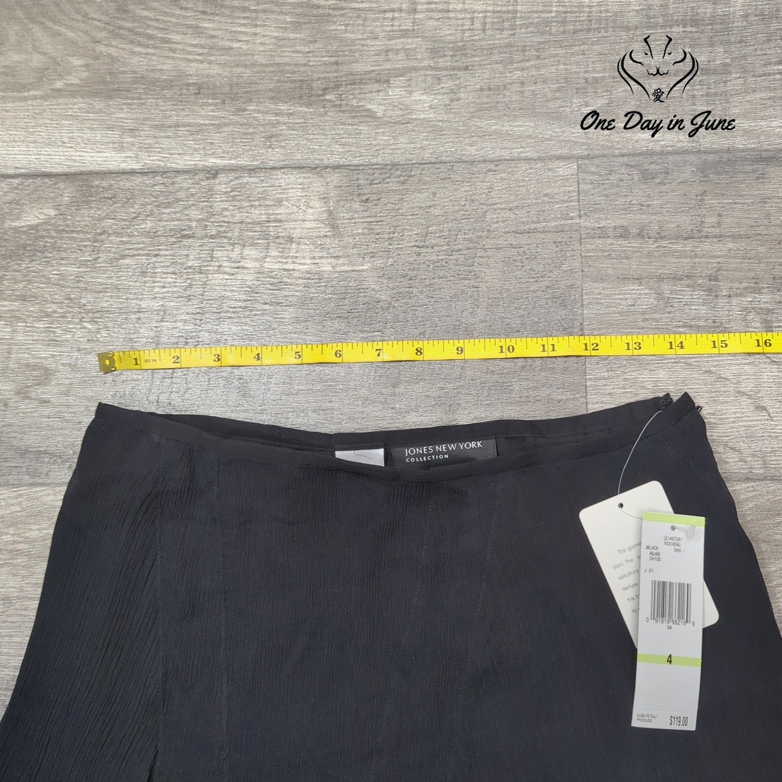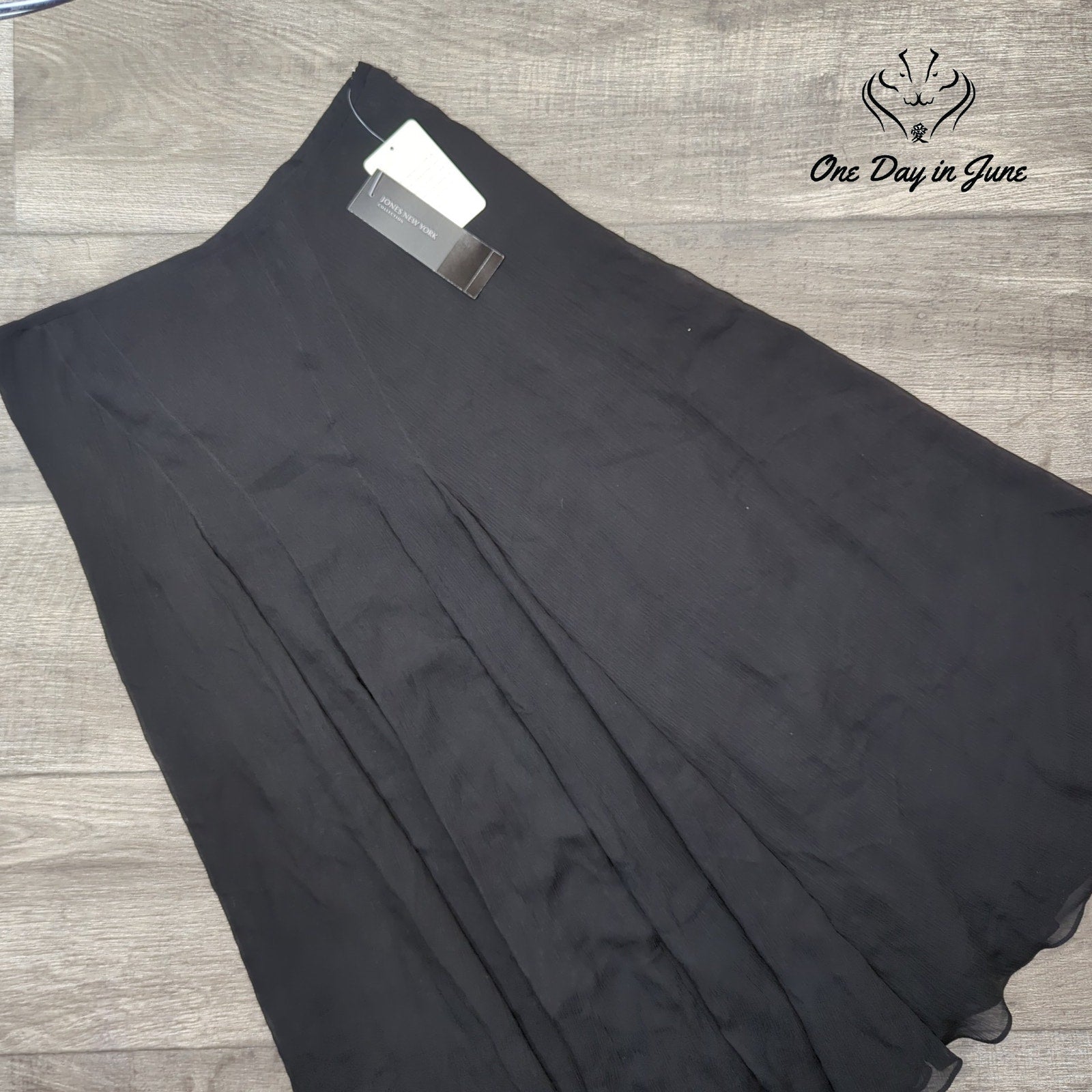 Fear and loathing in the world of high fashion, where the silk midi skirt reigns supreme, a black serpent slithering down the legs of the brave and beautiful. This Jones New York creation, pristine and untouched, beckons like a siren's call to those daring enough to dance on the razor's edge of style and substance.