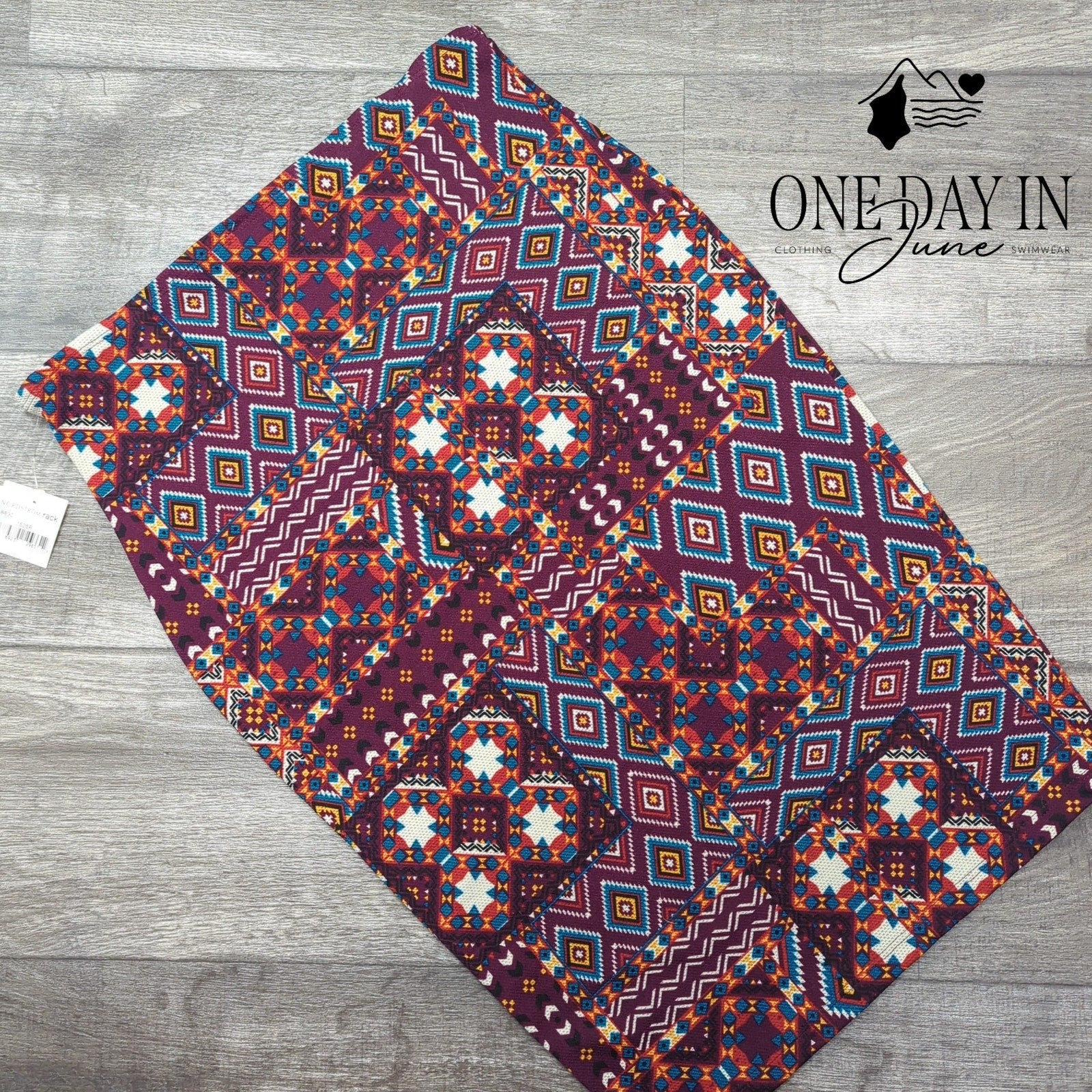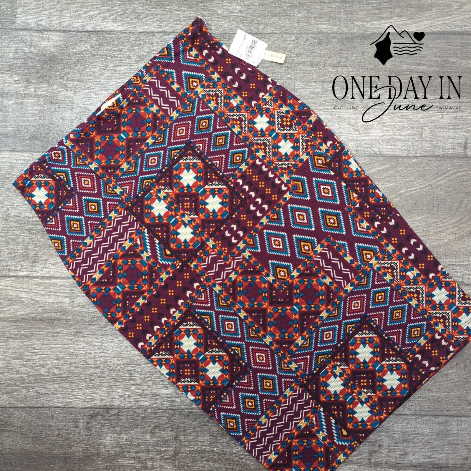 A most charming pencil skirt in a spirited red hue, adorned with tribal motifs that speak to the adventurous lady's desire for distinction. The flattering silhouette promises to embrace one's figure with the perfect balance of structure and gentle stretch, ensuring both elegance and comfort throughout the day's pursuits. Indeed, this delightful piece shall prove indispensable to any discerning woman's wardrobe, whether attending morning calls or evening entertainments.