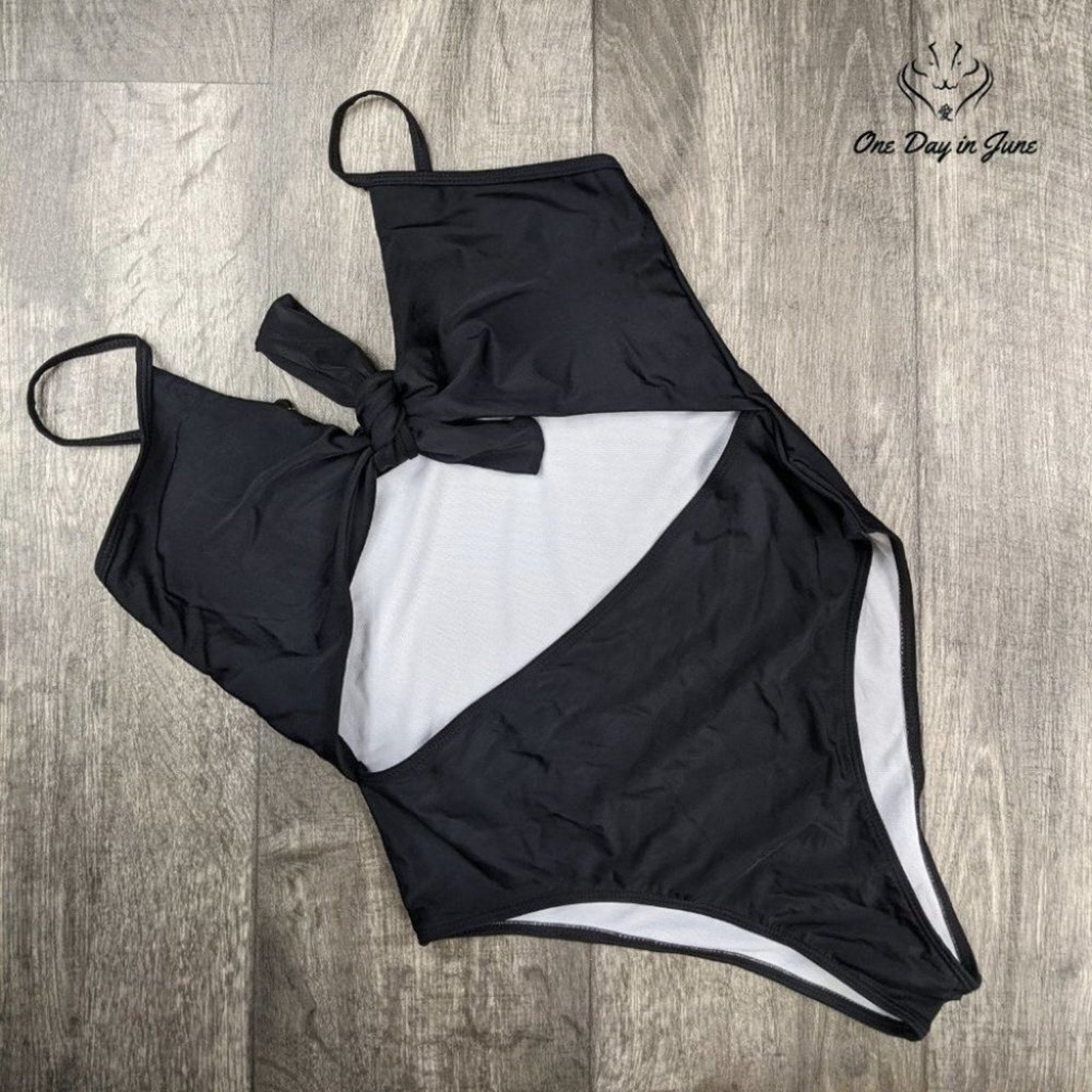 A most elegant and flattering one-piece swimsuit in deepest black, featuring a delightfully modern knotted detail at the bodice. The sleek silhouette, crafted from a comfortable blend of polyester and spandex, promises to cut a fine figure whether one is taking a turn about the pool or lounging gracefully beneath a parasol.