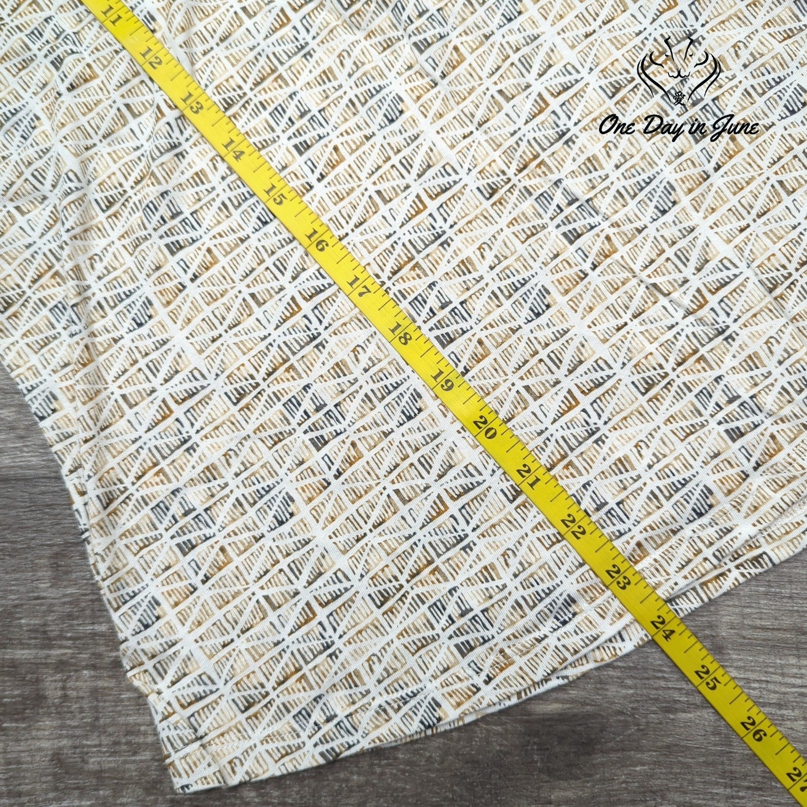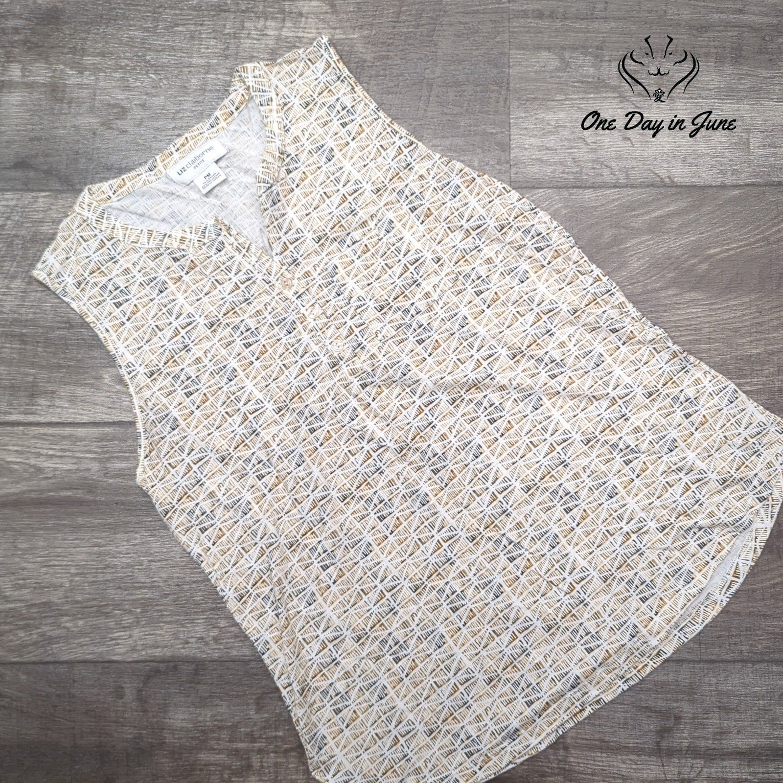 A delightful tan tank top from the esteemed house of Liz Claiborne, perfect for the discerning lady of refinement. This gently used garment, crafted from a blend of rayon and polyester, offers both comfort and elegance for those warm summer days when one wishes to appear both fashionable and at ease.