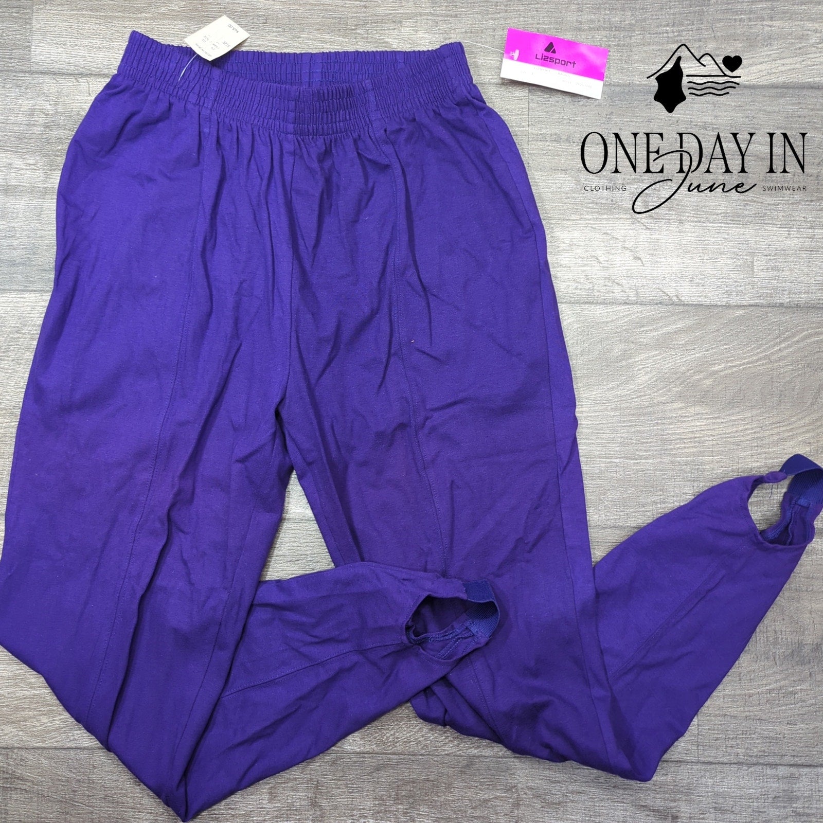 These delightful stirrup pants from Liz Claiborne Sport present themselves in a most becoming shade of purple, offering both comfort and elegance for the active lady. Crafted from a pleasing blend of cotton and spandex, they provide the perfect balance of ease and structure for one's daily pursuits. The convenient pull-on design ensures that even the most hurried morning toilette shall proceed with grace and efficiency.