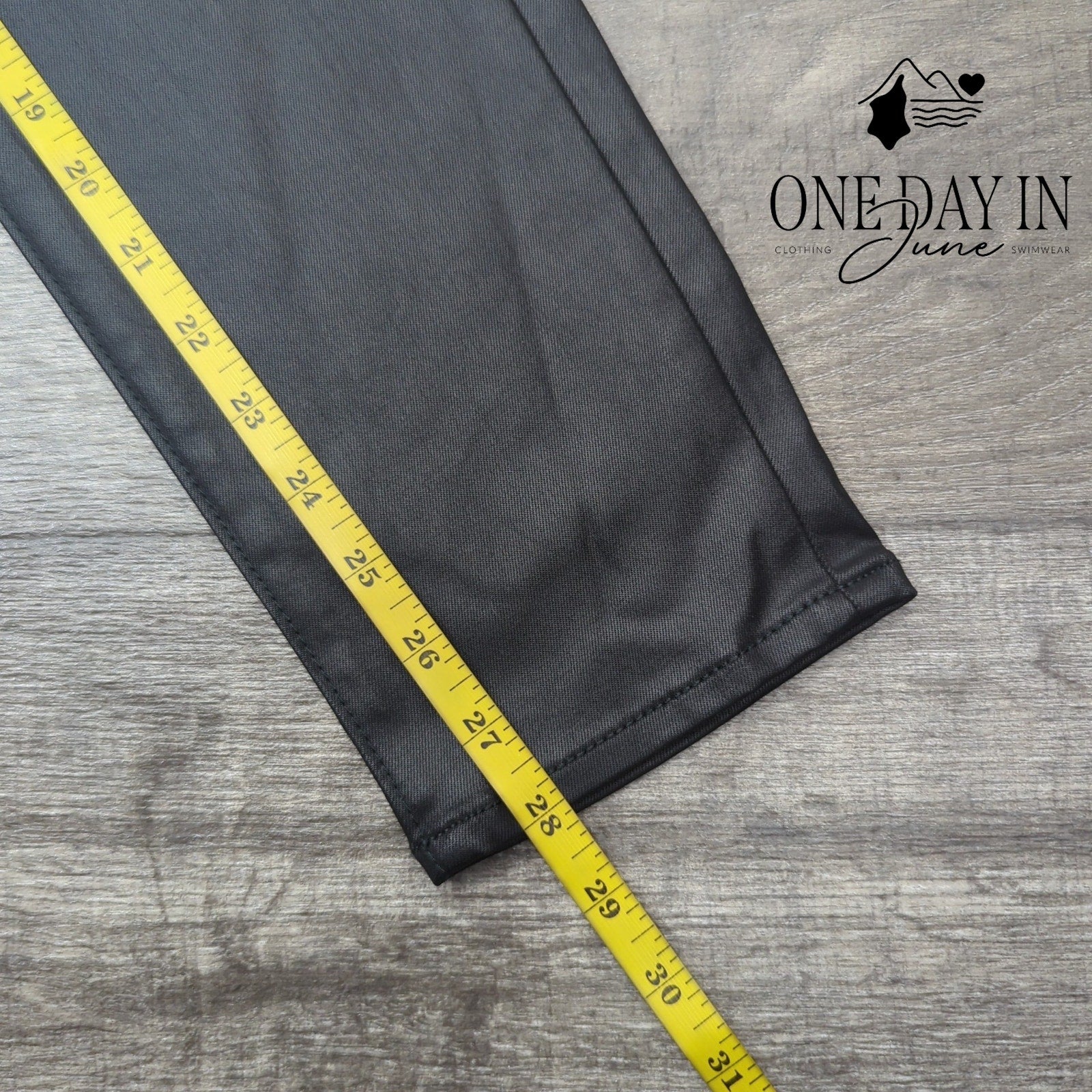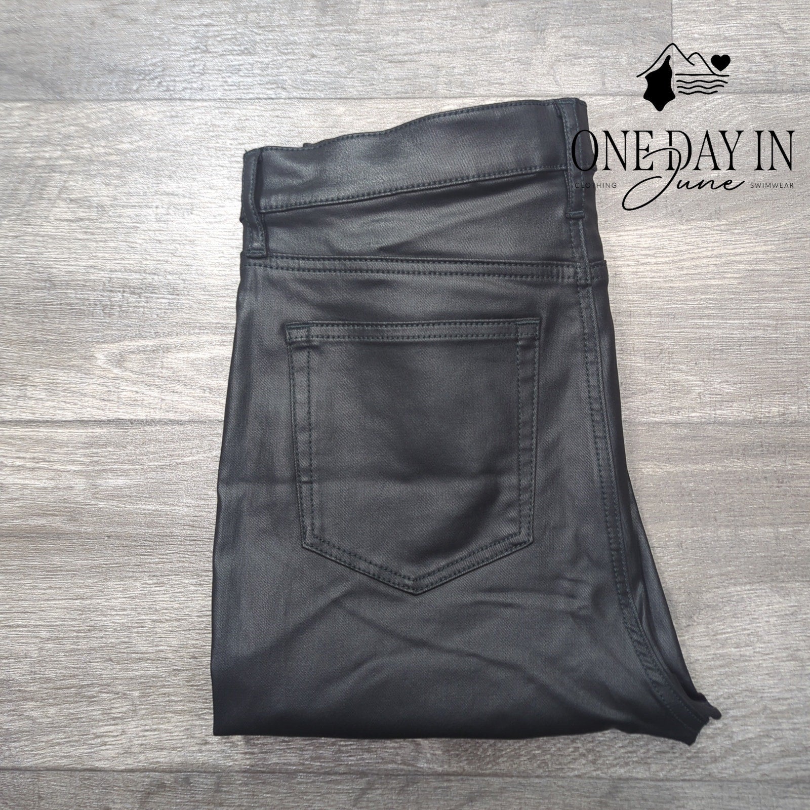 These sleek black jeans possess a lustrous coated finish that catches light like moonbeams on a still lake. Crafted with a luxurious modal blend that promises both comfort and sophistication, they embody the modern woman's pursuit of effortless elegance. A testament to refined taste, they whisper of midnight soirées and dawn adventures alike.