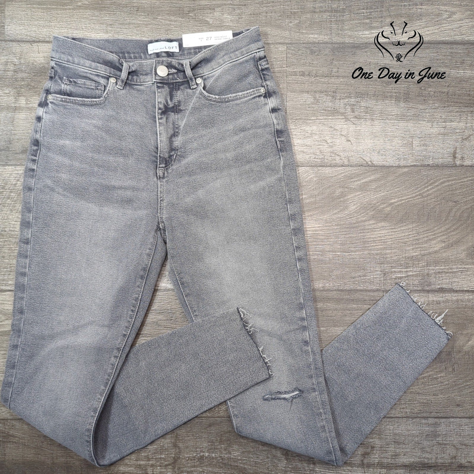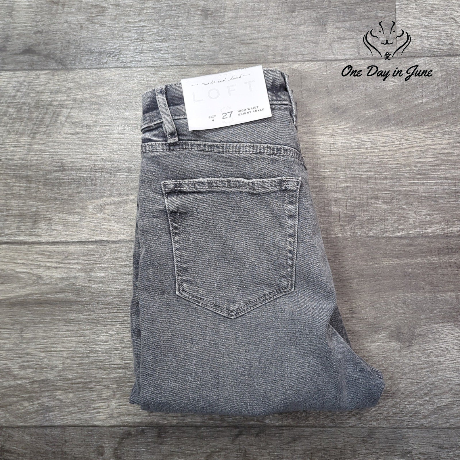Oh what a pair of jeans so neat, a high-waist skinny cut that's hard to beat! These new grey ankle-length jeans from LOFT are snug and soft and sure to please, with comfy stretch for moving with ease.